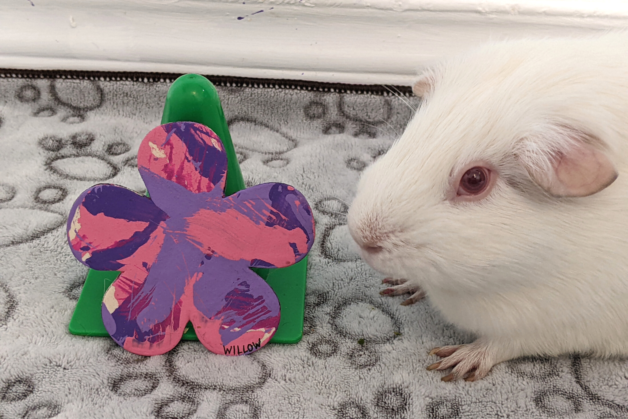 Willow had a rough start to life as an ex-lab piggy, but she has been living with me and her piggy friends over the last couple of years and has truly blossomed into an amazingly sweet and outgoing girl. I’m truly lucky to have her and show the world how colorful these sweet albino piggies are on the inside. ♥︎