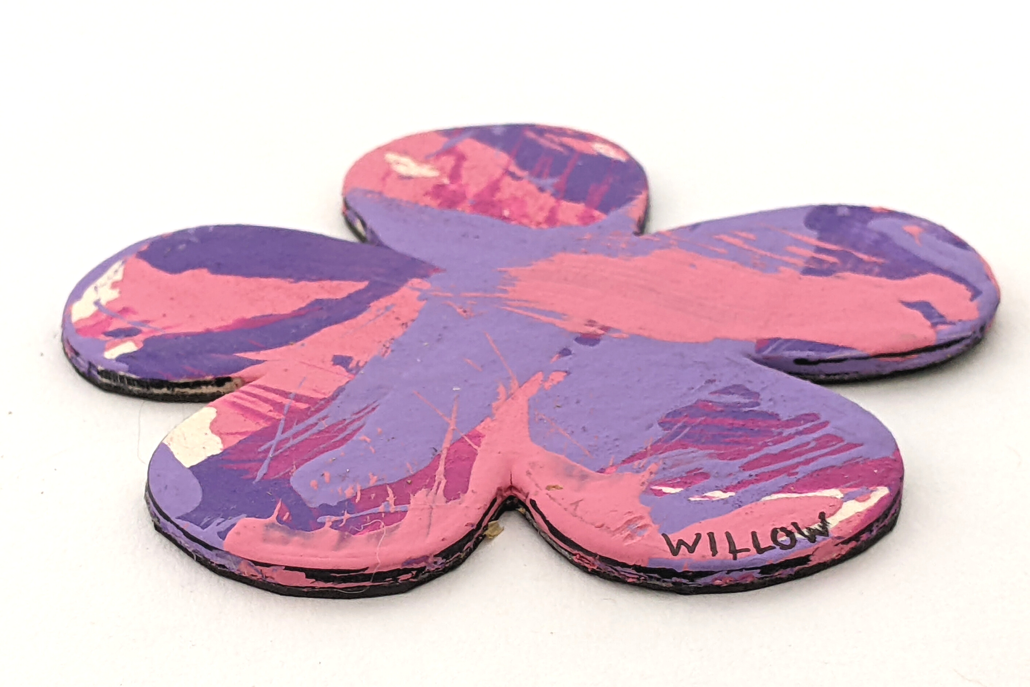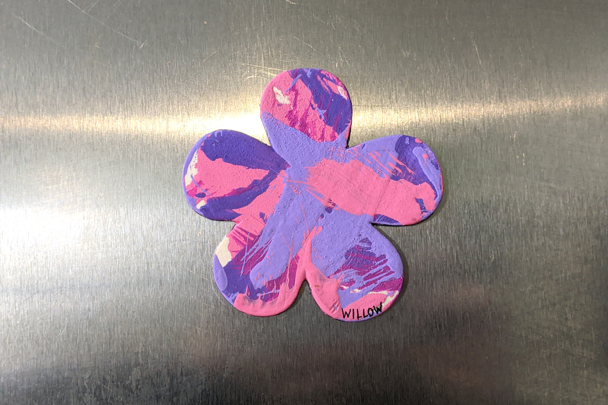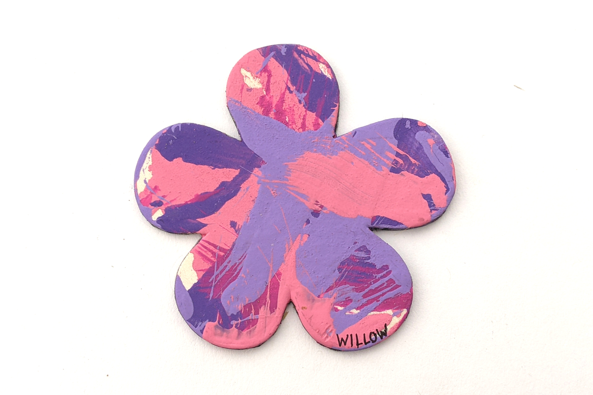 Magnet paintings are so cute and fun to display on the fridge, lockers, or any other metal surface. This adorable flower-shaped magnet features multiple shades of pink and purple and was made by Willow.