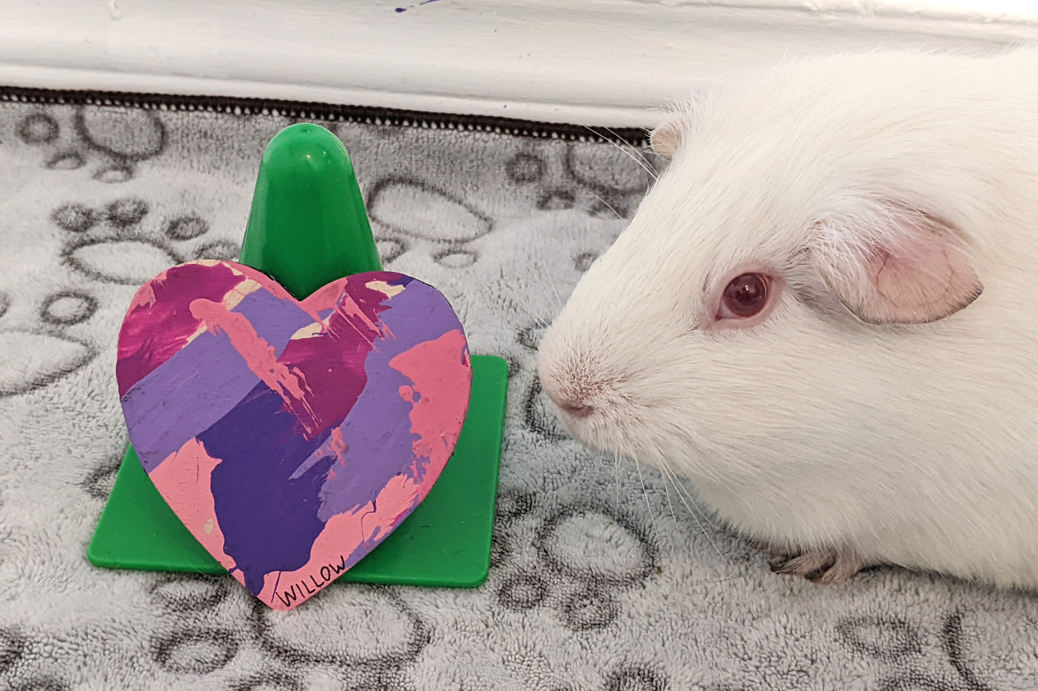 Willow had a rough start to life as an ex-lab piggy, but she has been living with me and her piggy friends over the last couple of years and has truly blossomed into an amazingly sweet and outgoing girl. I’m truly lucky to have her and show the world how colorful these sweet albino piggies are on the inside. ♥︎