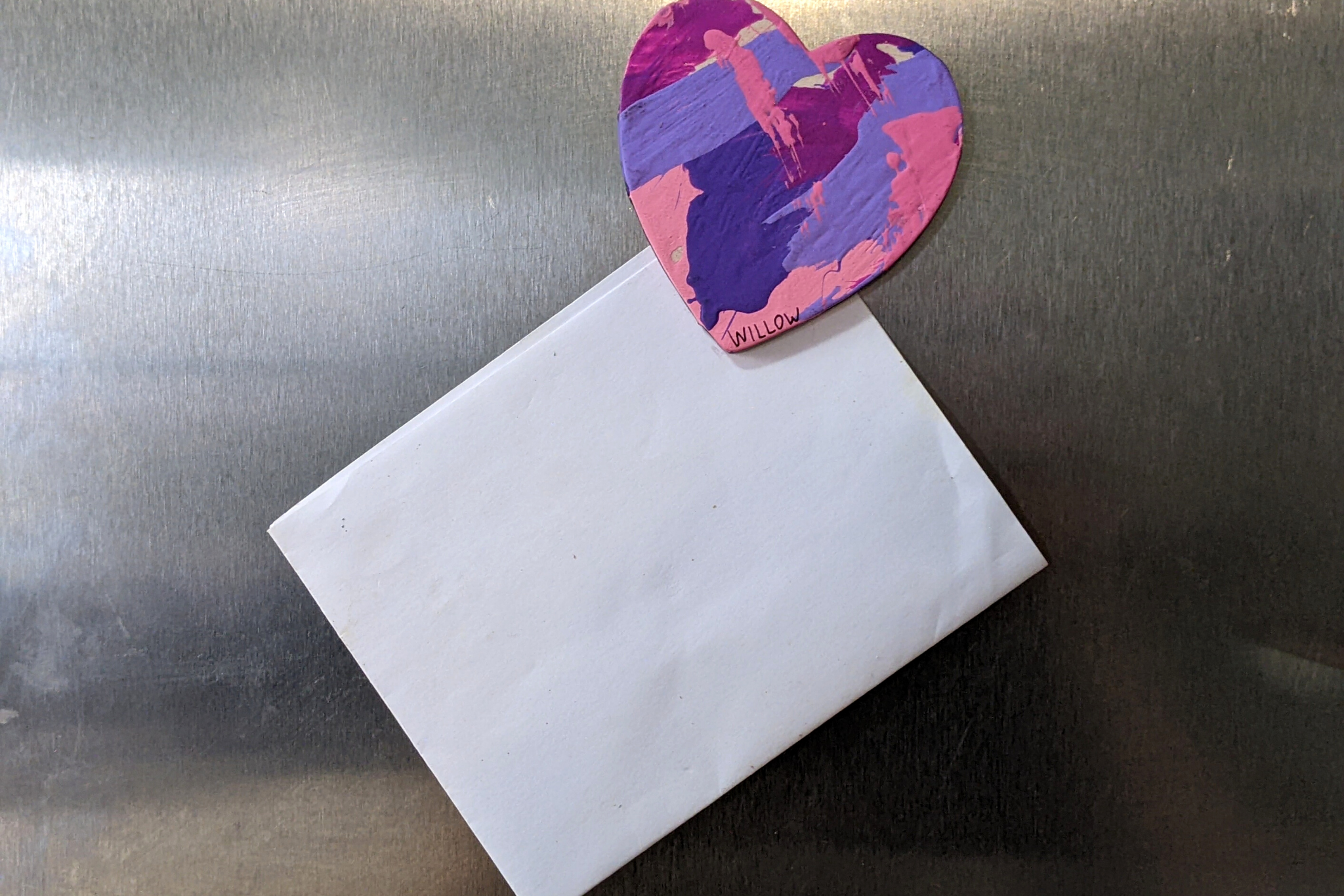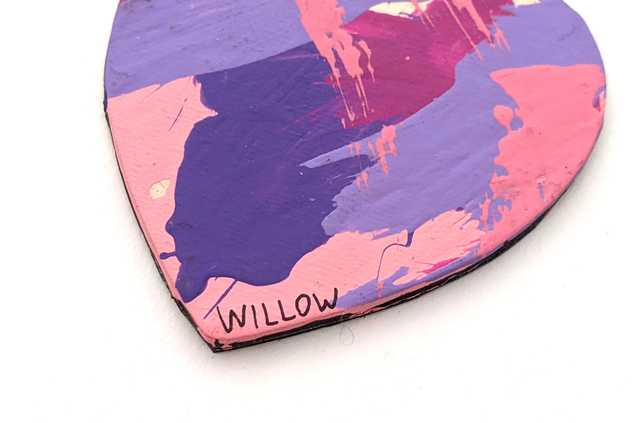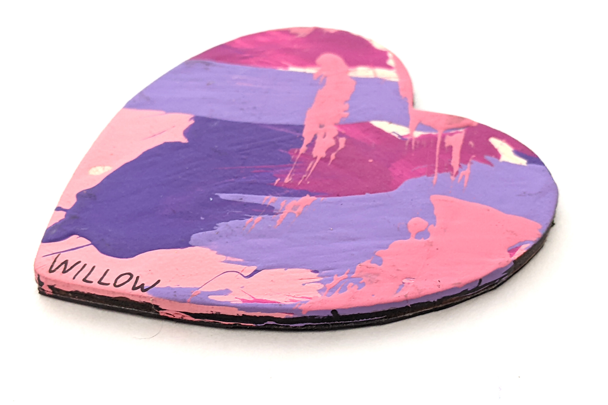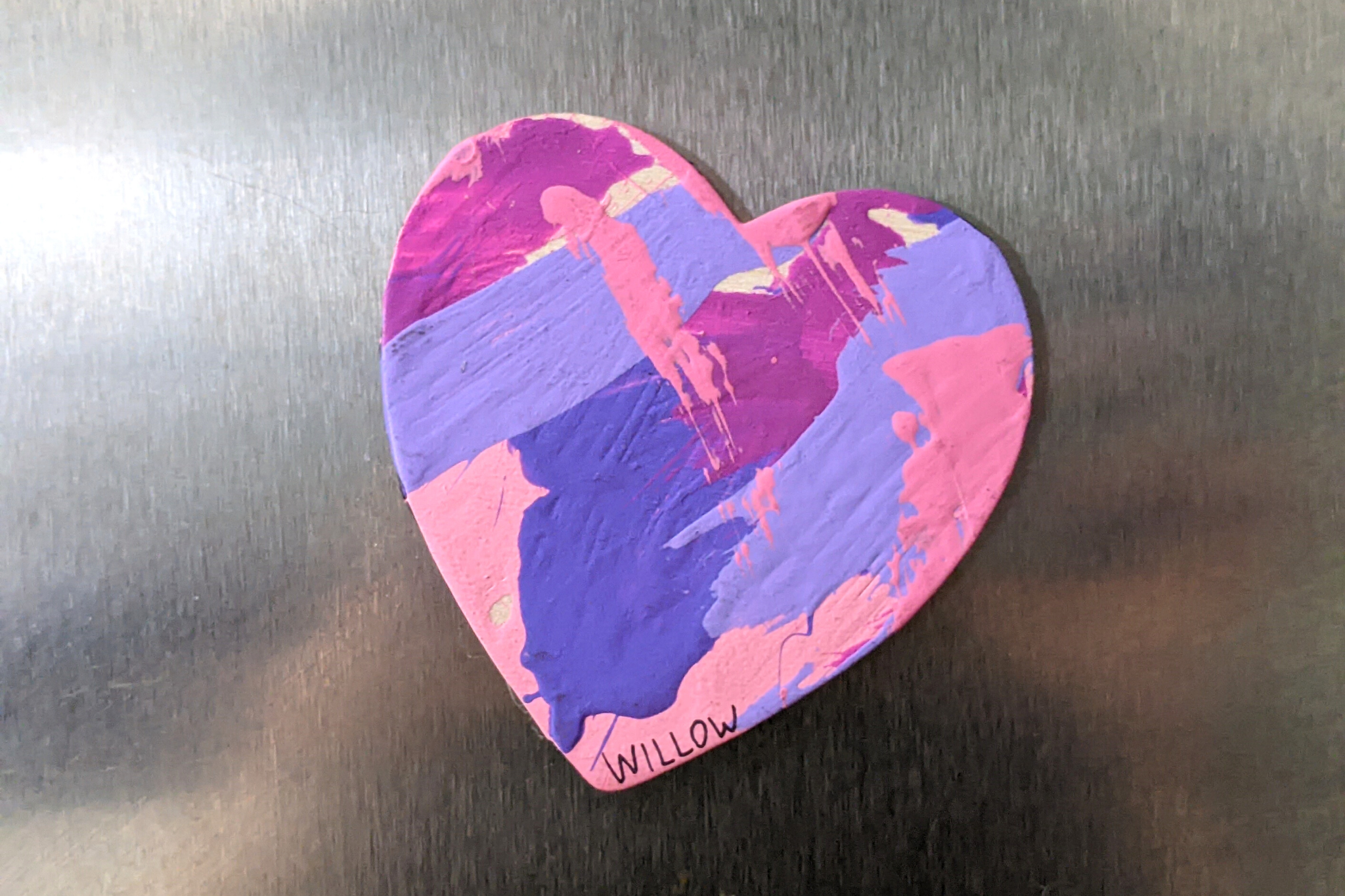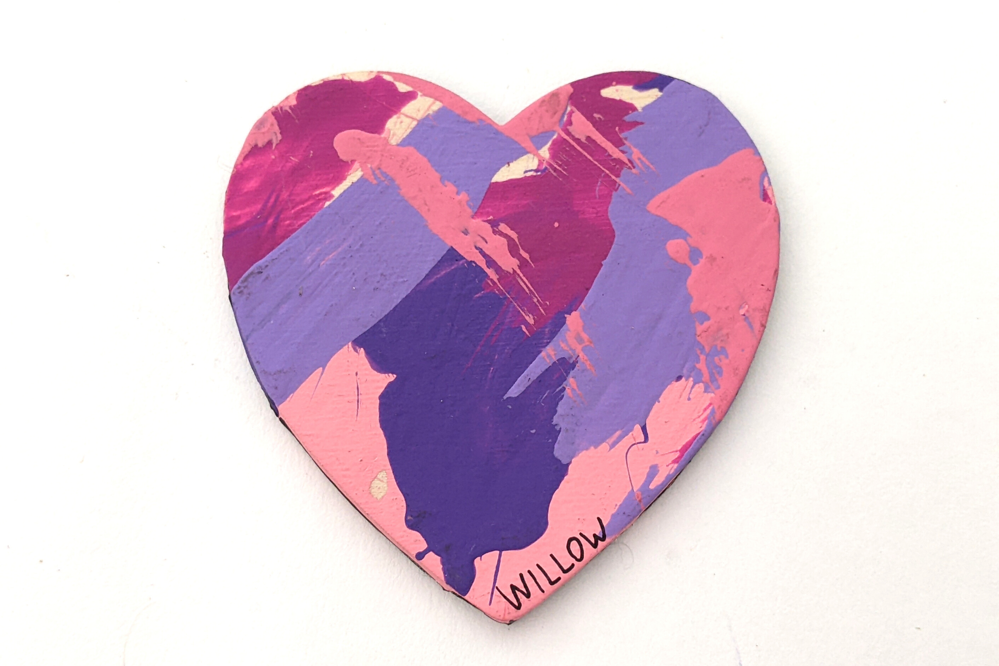 Magnet paintings are so cute and fun to display on the fridge, lockers, or any other metal surface. This adorable heart-shaped magnet features multiple shades of pink and purple and was made by Willow.