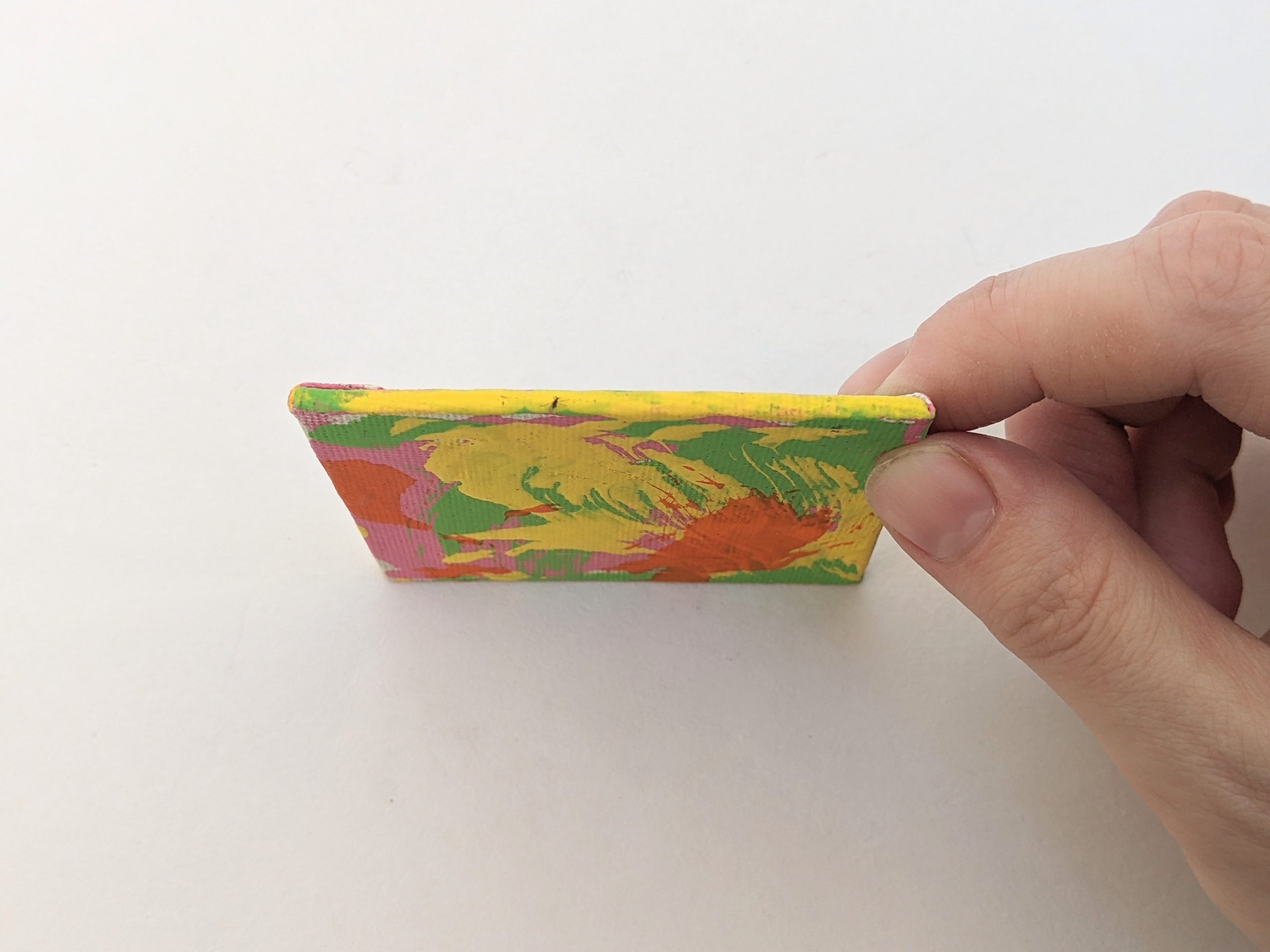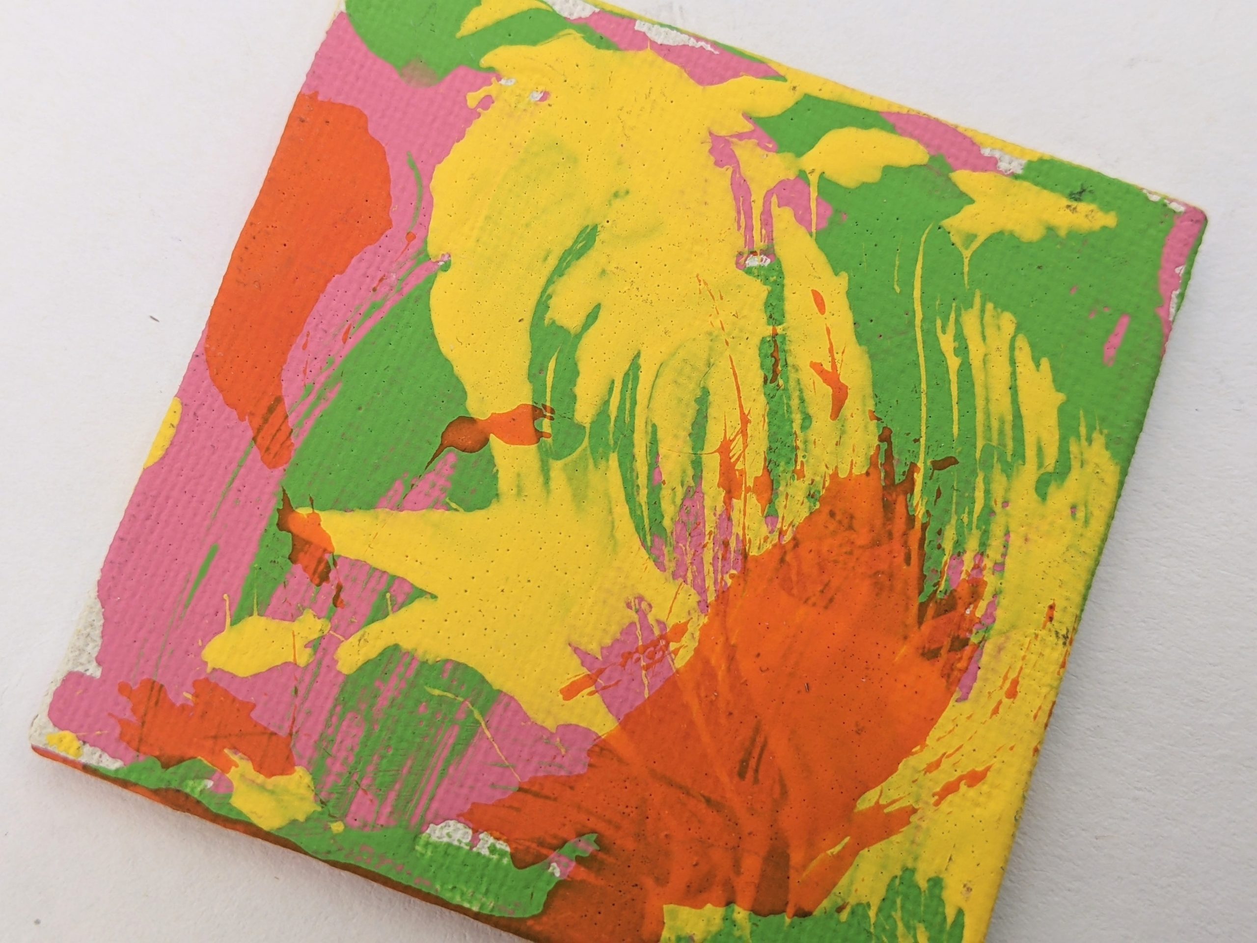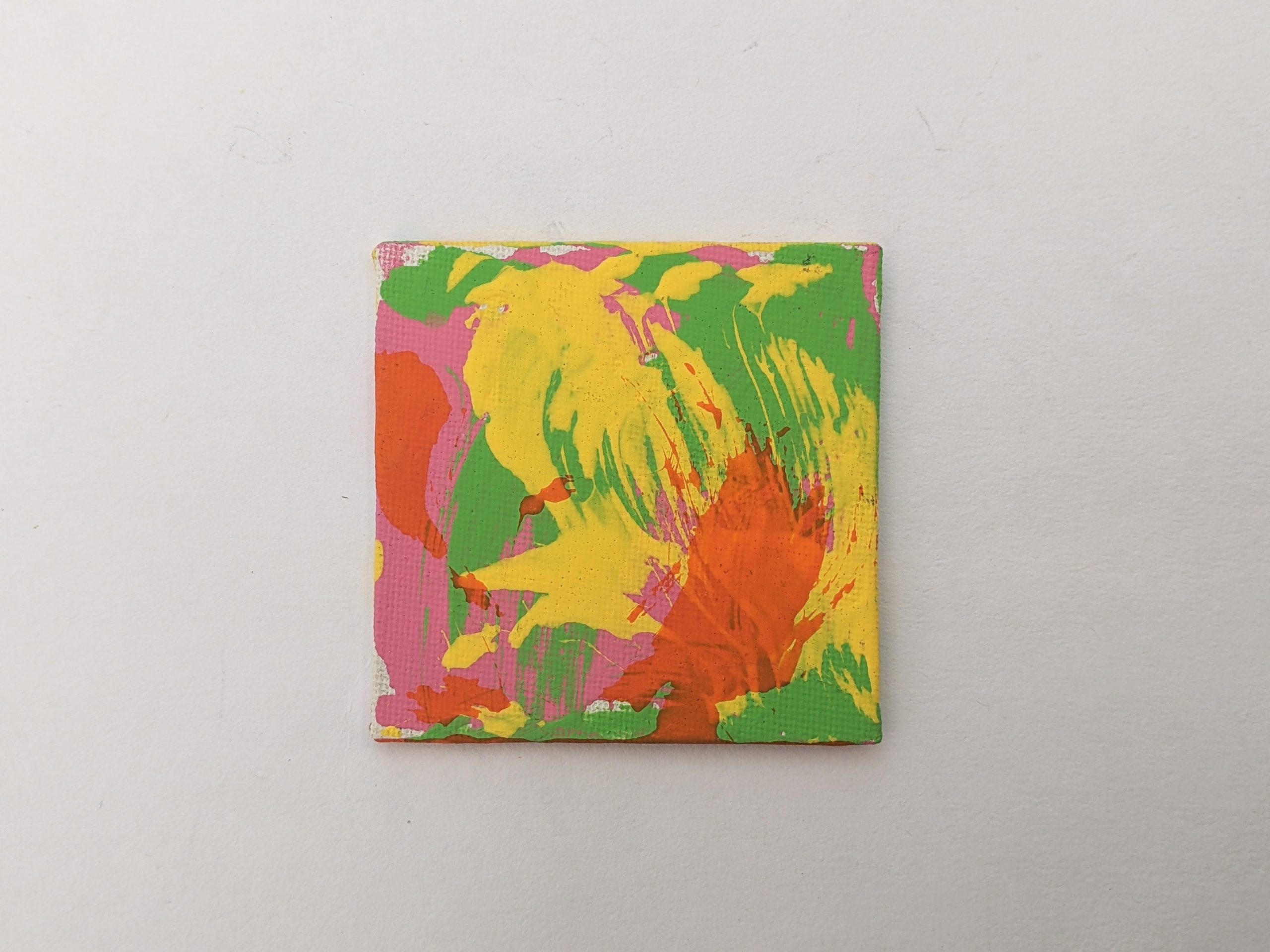 This cute mini painting was created by Willow! ♥︎ Her beautiful mini canvas painting features a bright and fun combination of orange, yellow, pink, and green.