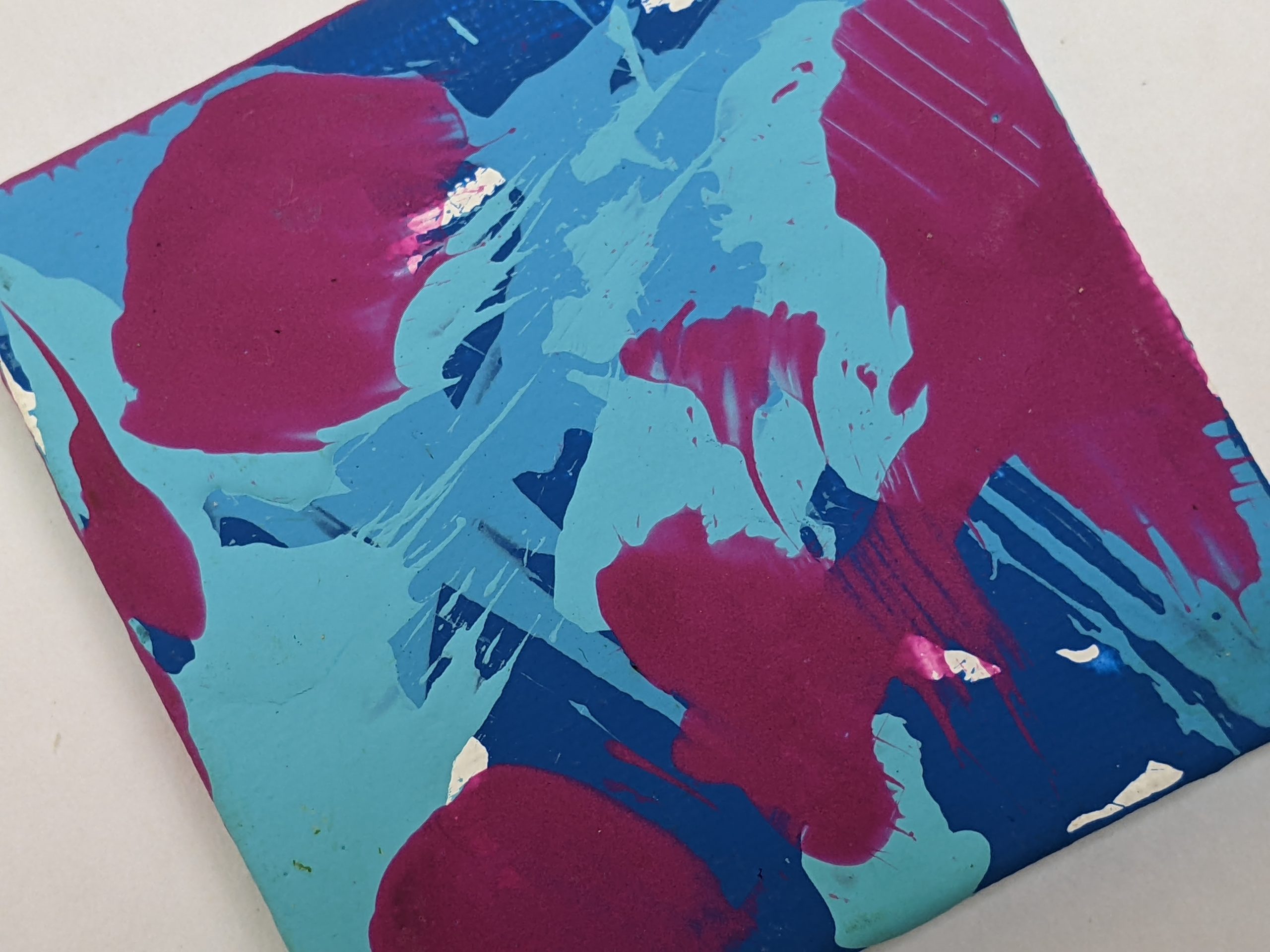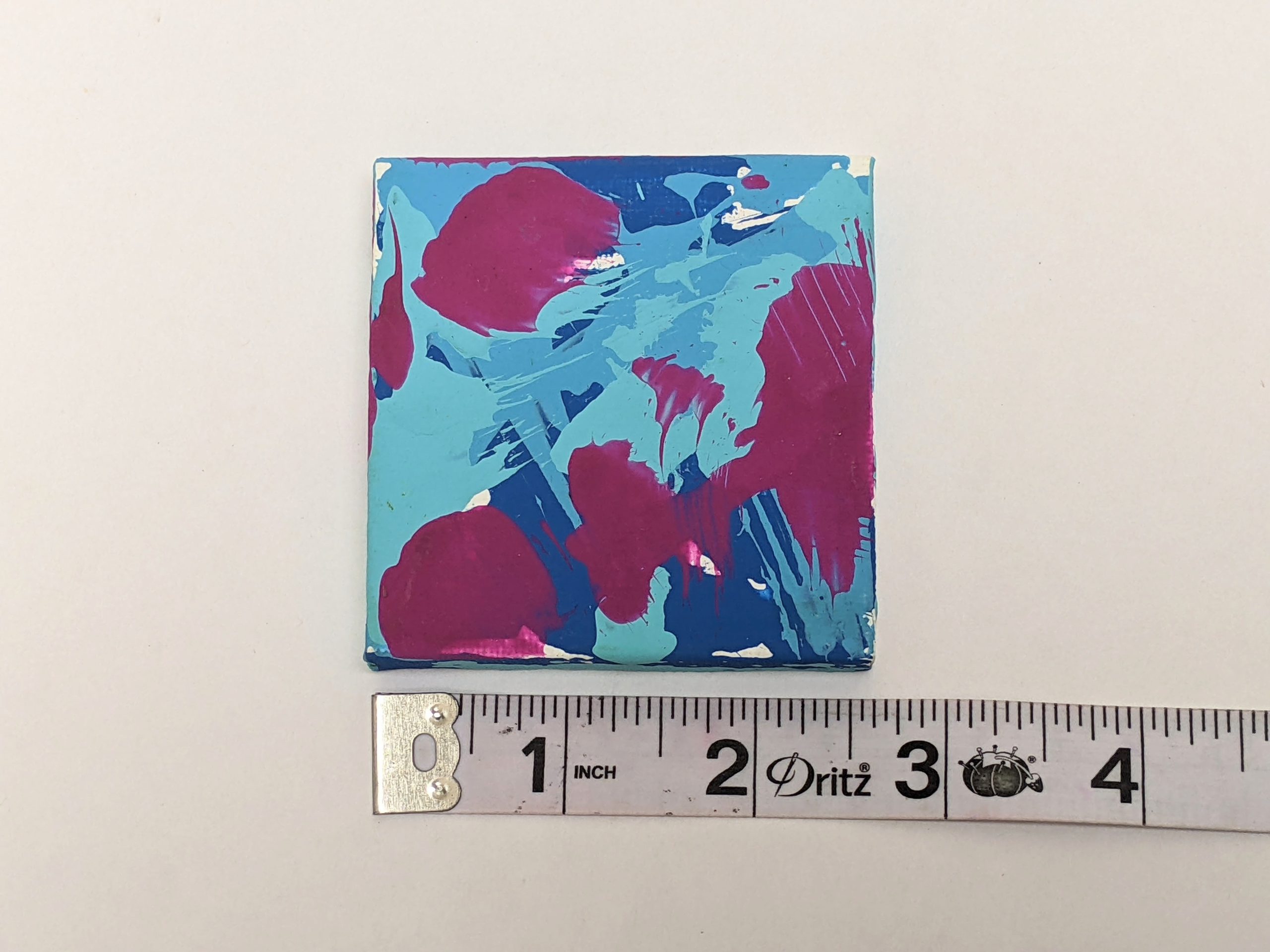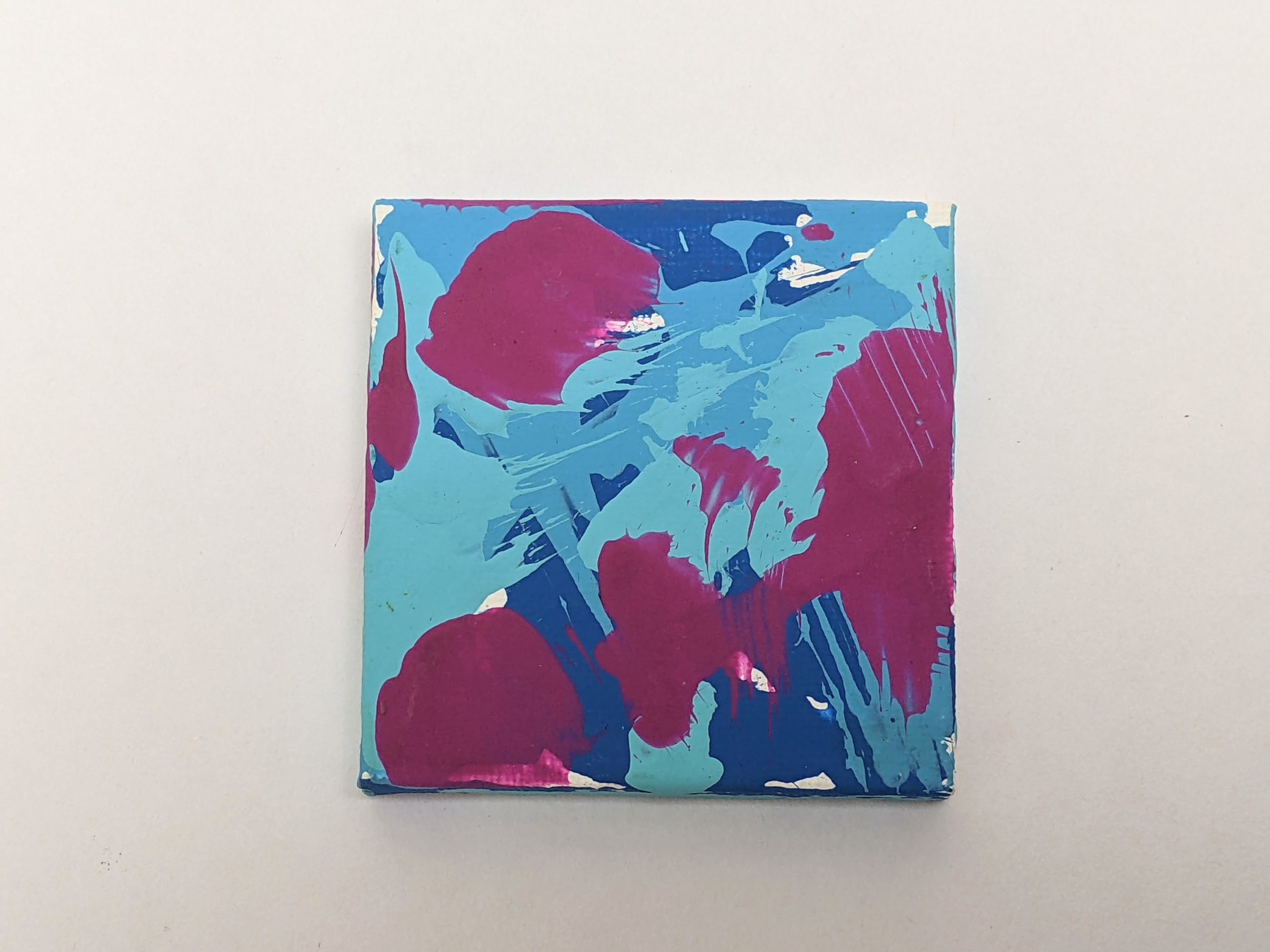 This cute mini painting was created by Willow! ♥︎ Her beautiful mini canvas painting features a cool combination of dark pink with multiple shades of blue.