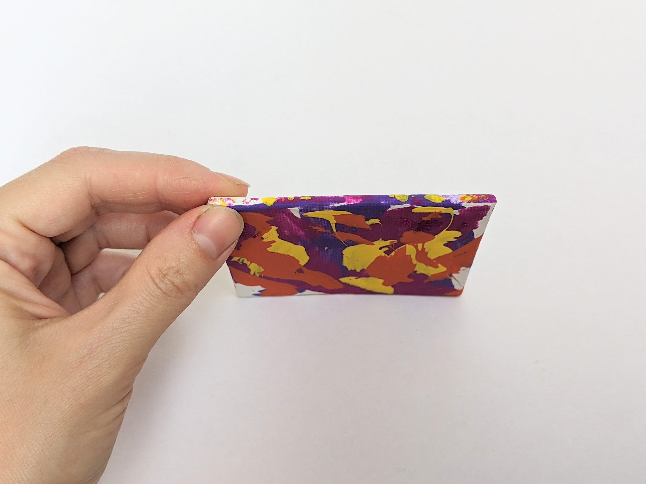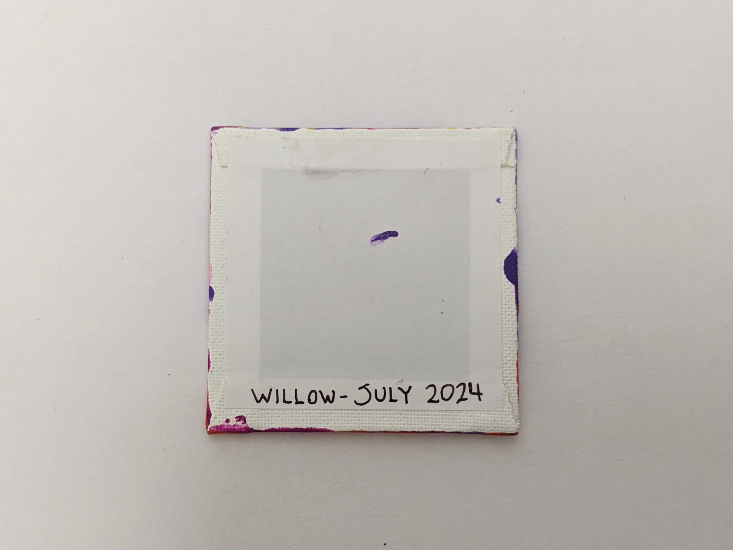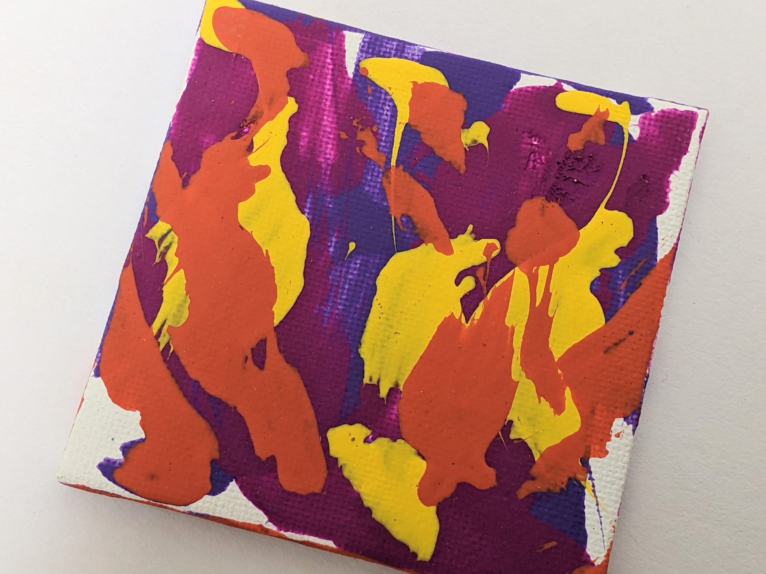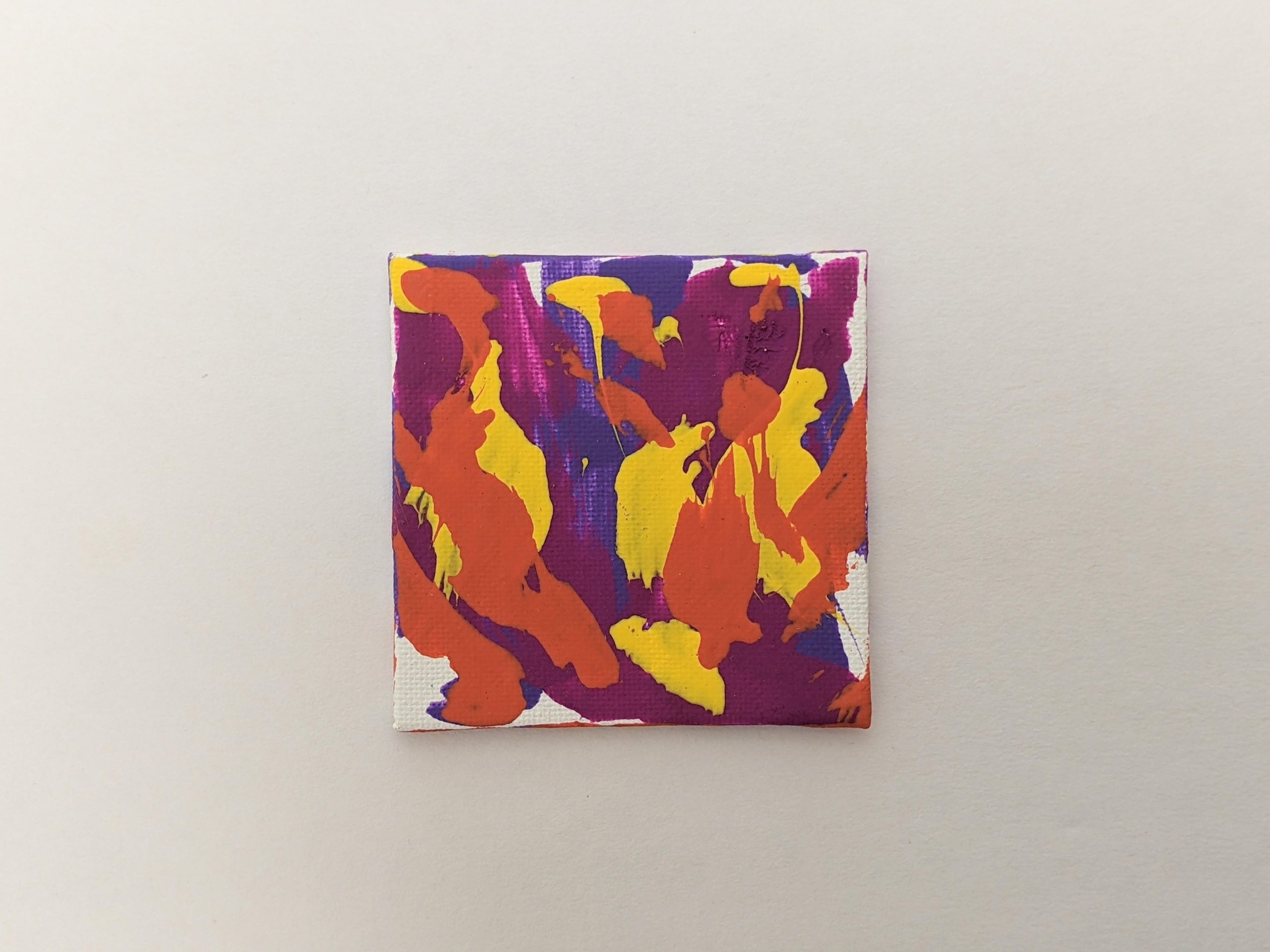 This cute mini painting was created by Willow! ♥︎ Her beautiful mini canvas painting features a bright and fun combination of purple, dark pink, orange, and yellow.