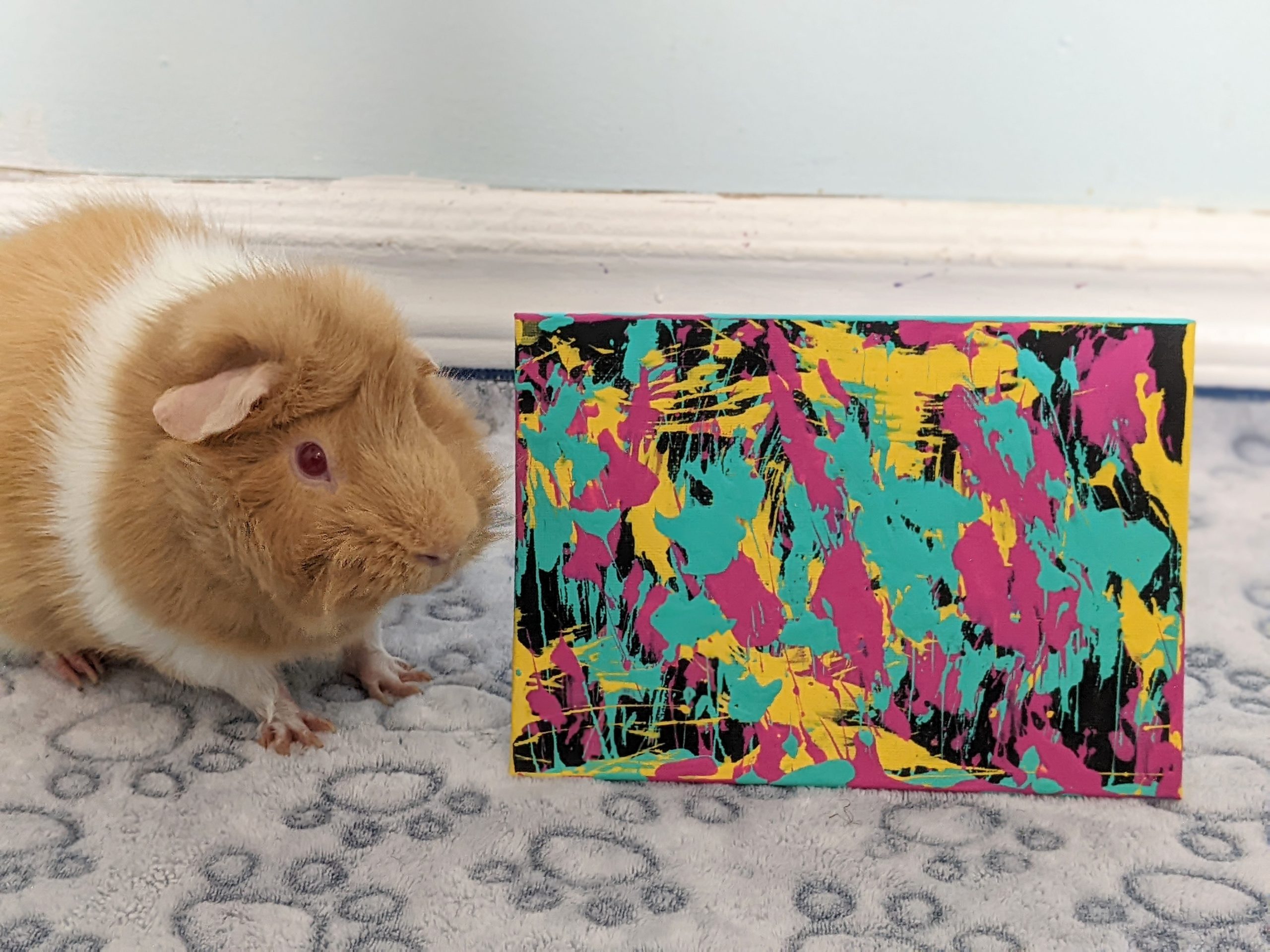 This painting was created by Skittles and features a pretty color combo of pink, yellow, and teal. ❤️ This painting also includes a partial video of Skittles painting her masterpiece, available to download at checkout.