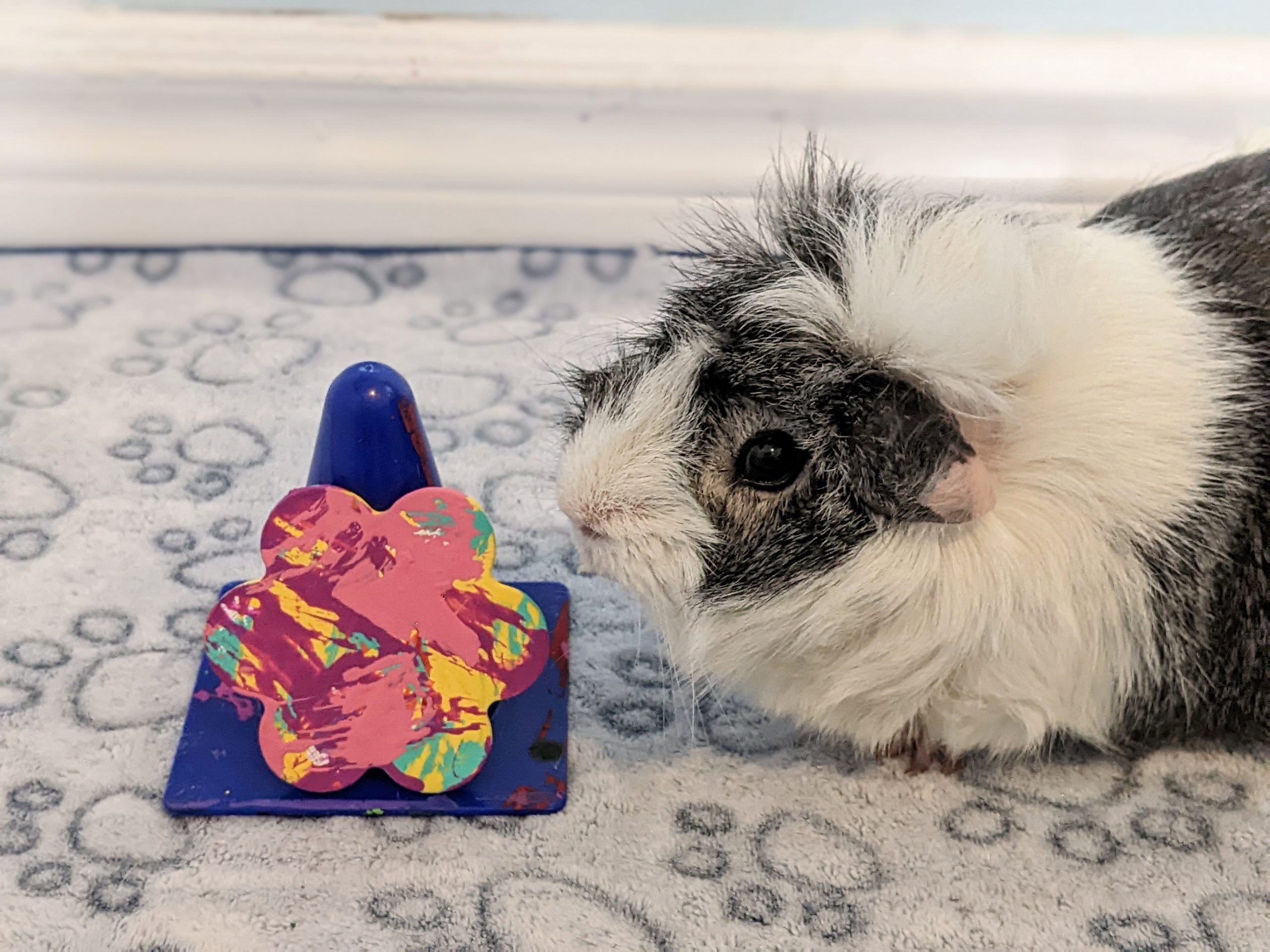 Pansy is a chill and laidback piggy. She is a super cute floof and she knows it! Pansy loves the princess treatment and can usually be found sprawled out on a fluffy bed.