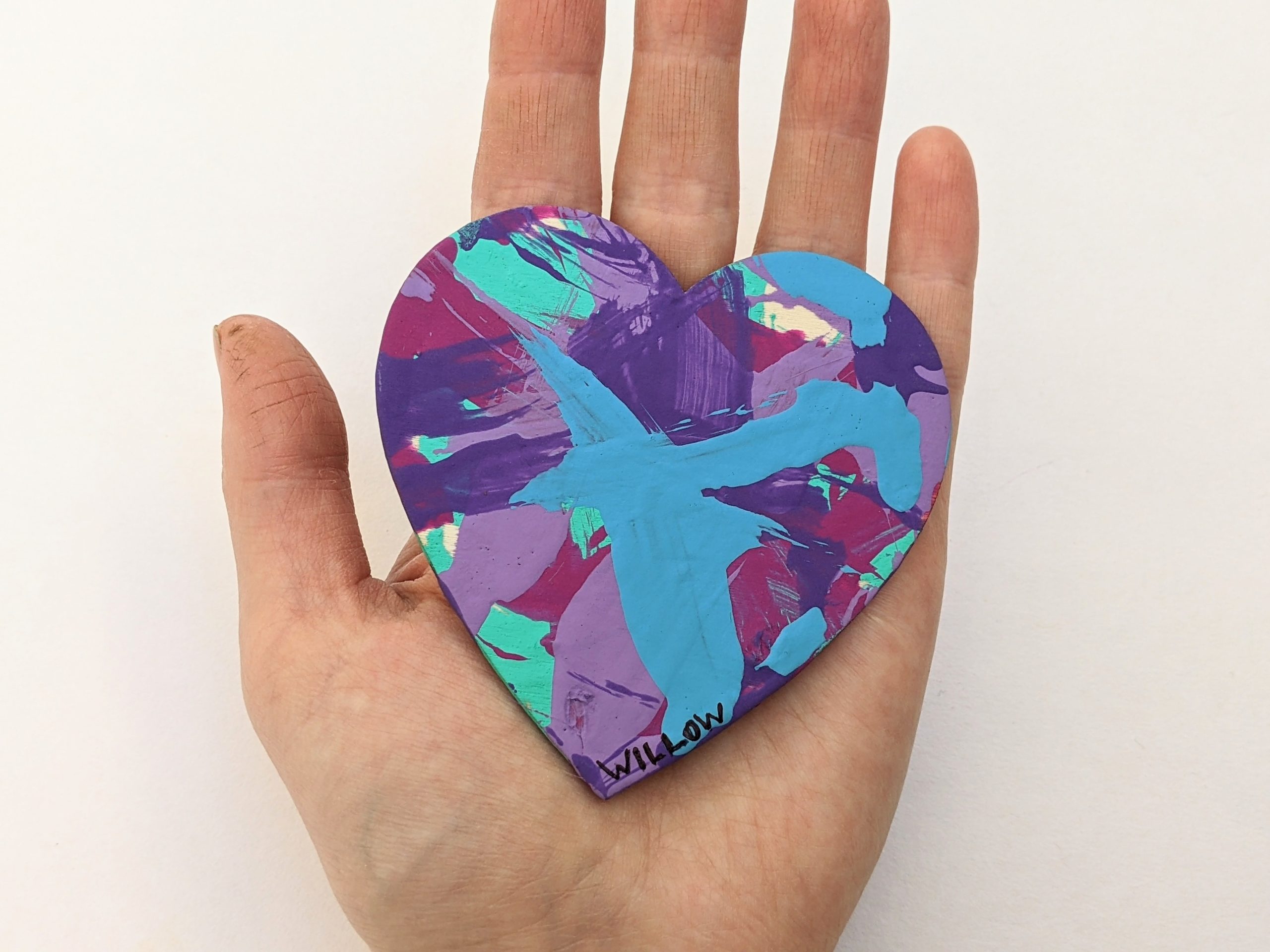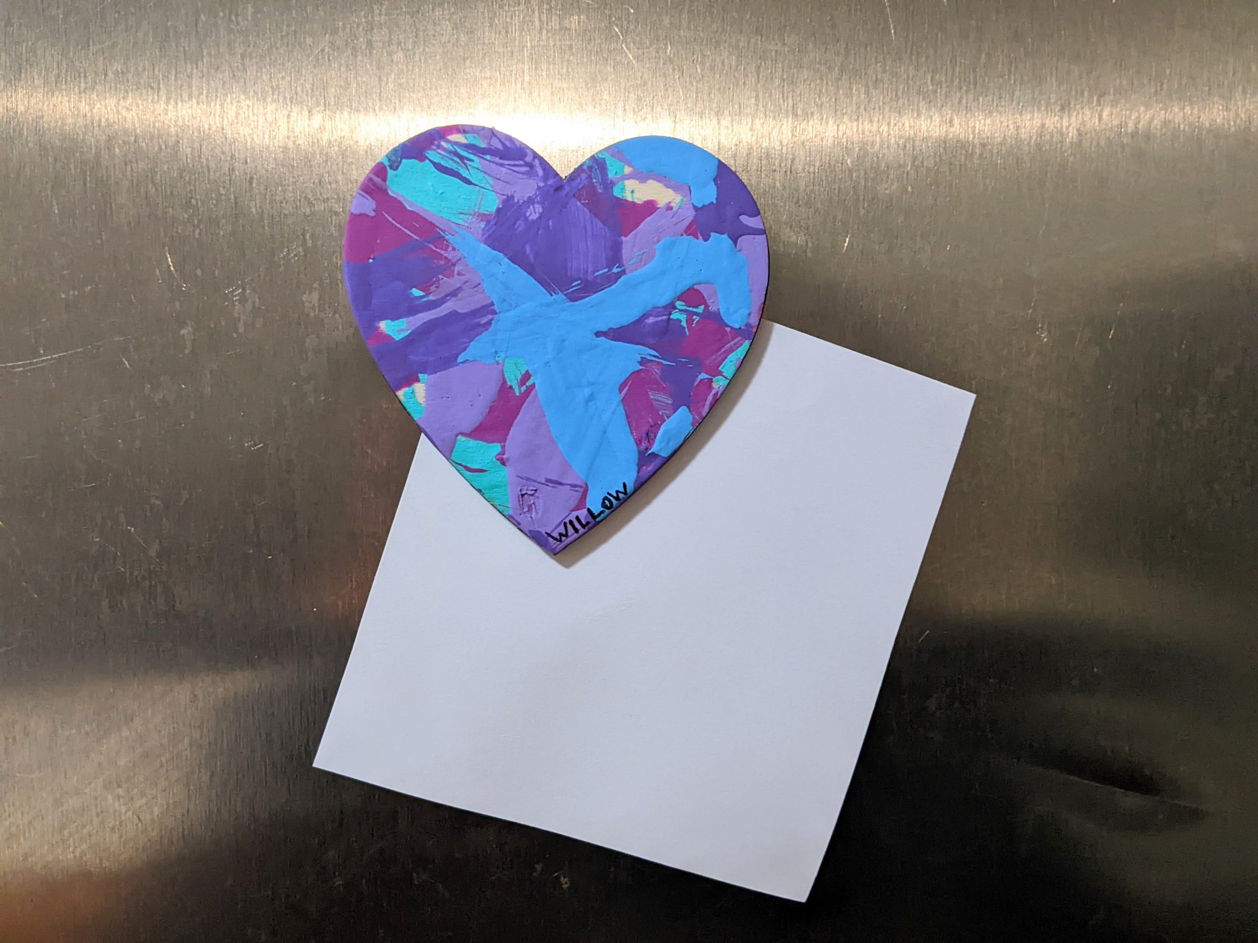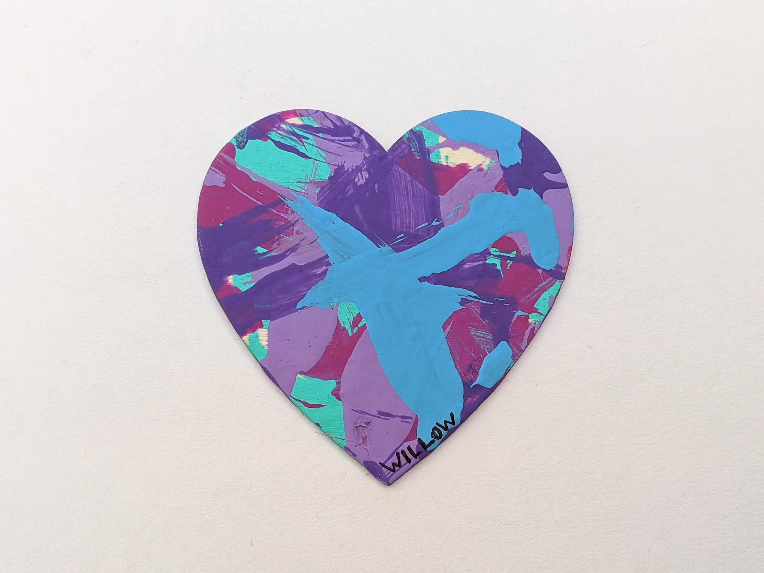 Magnet paintings are so cute and fun to display on the fridge, lockers, or any other metal surface. This adorable heart-shaped magnet features pink, purple, blue, and teal and was made by Willow.