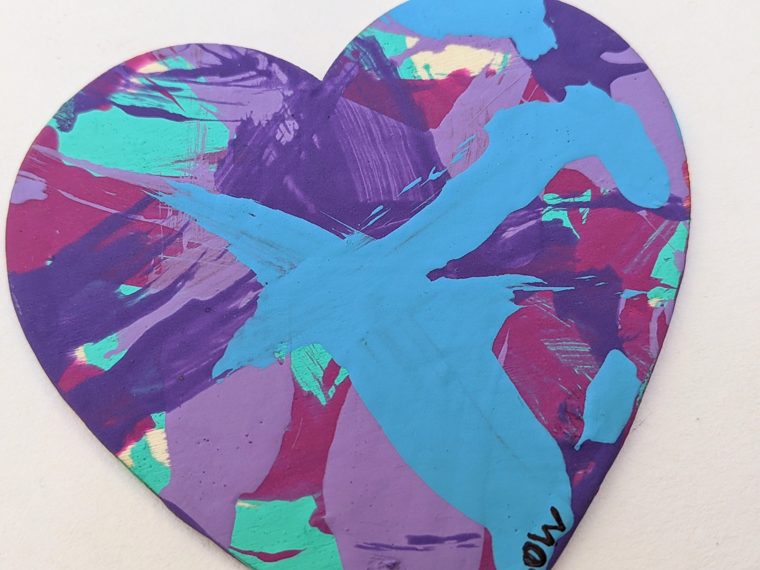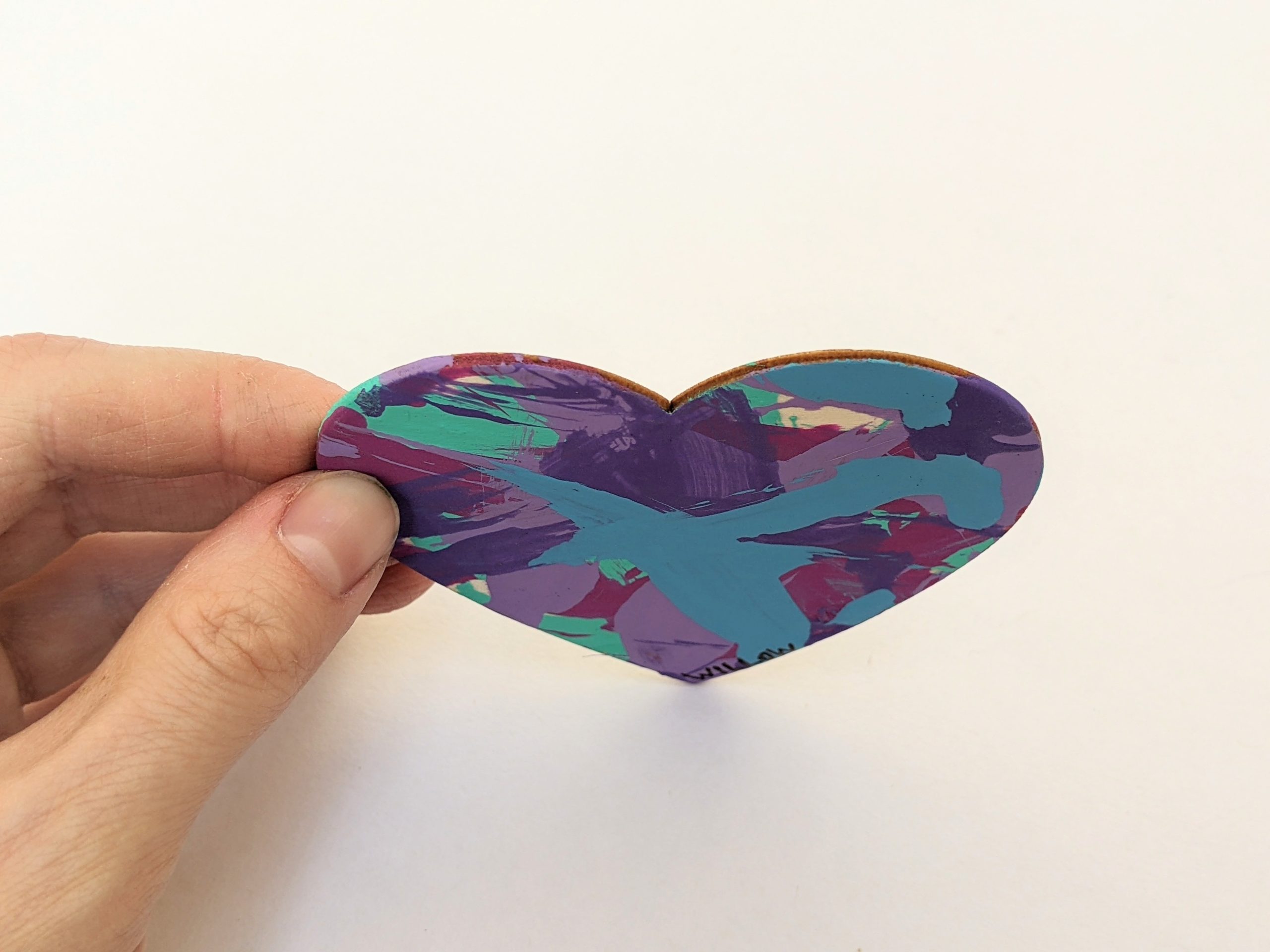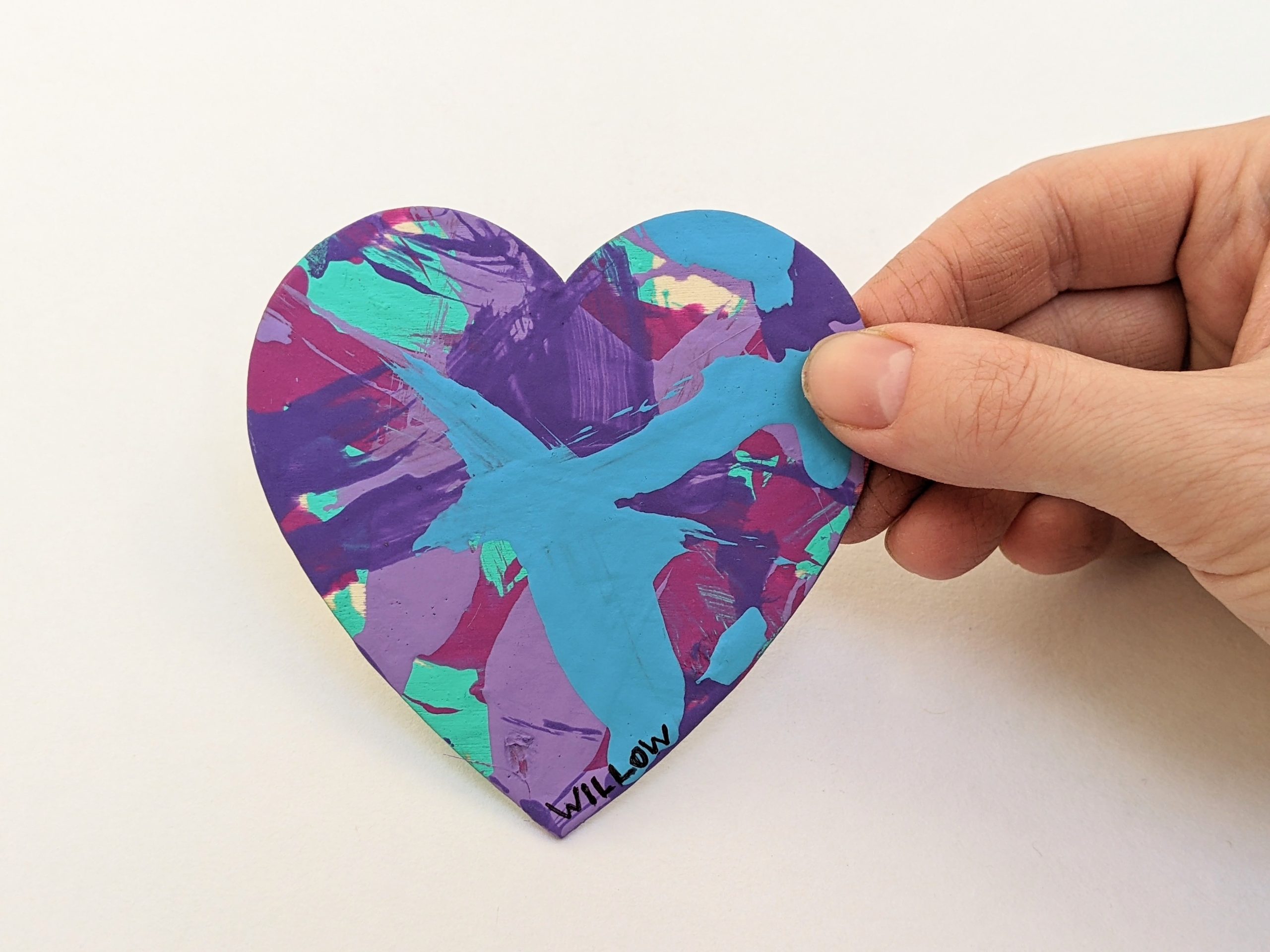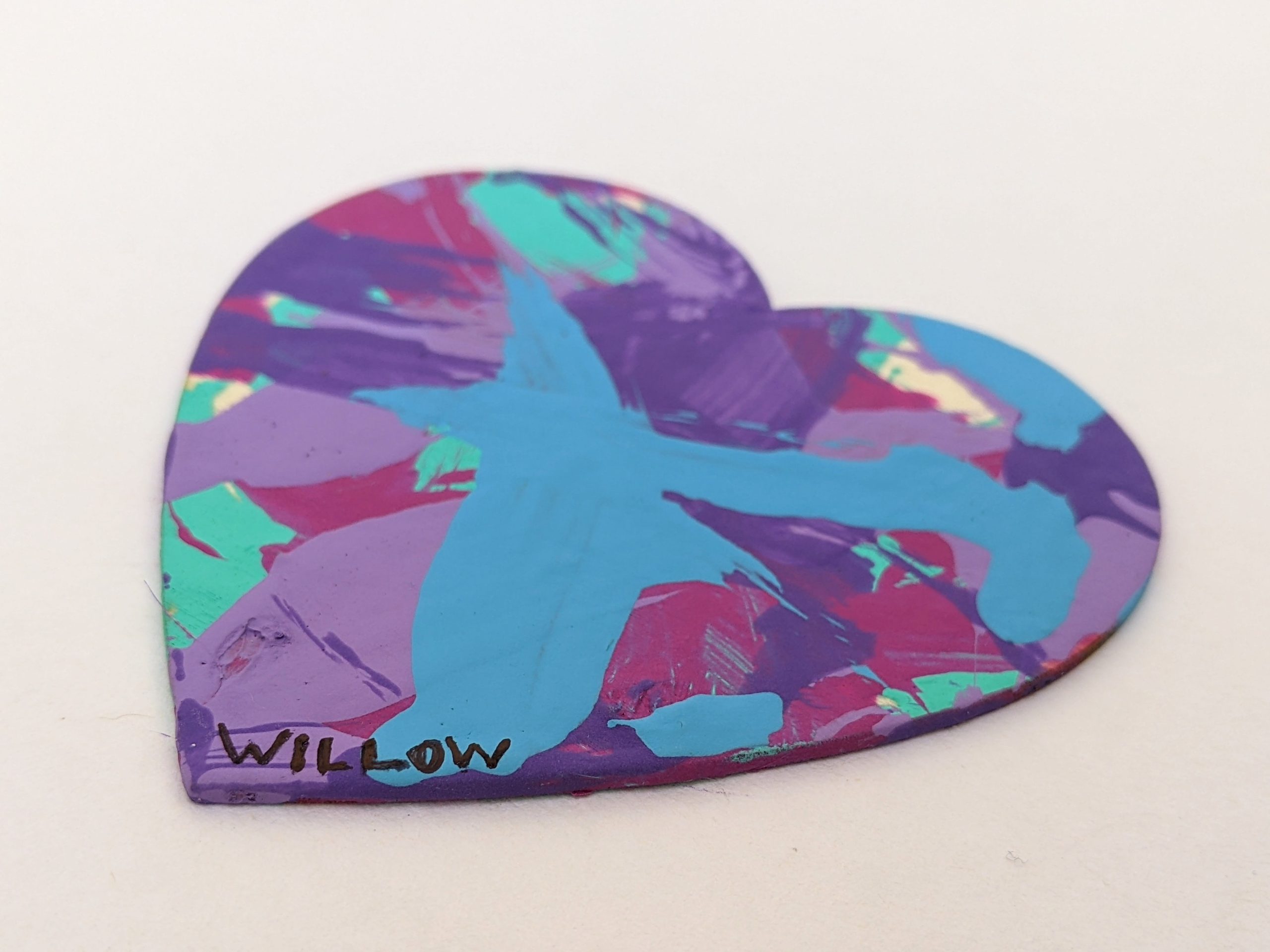 Magnet paintings are so cute and fun to display on the fridge, lockers, or any other metal surface. This adorable heart-shaped magnet features pink, purple, blue, and teal and was made by Willow.
