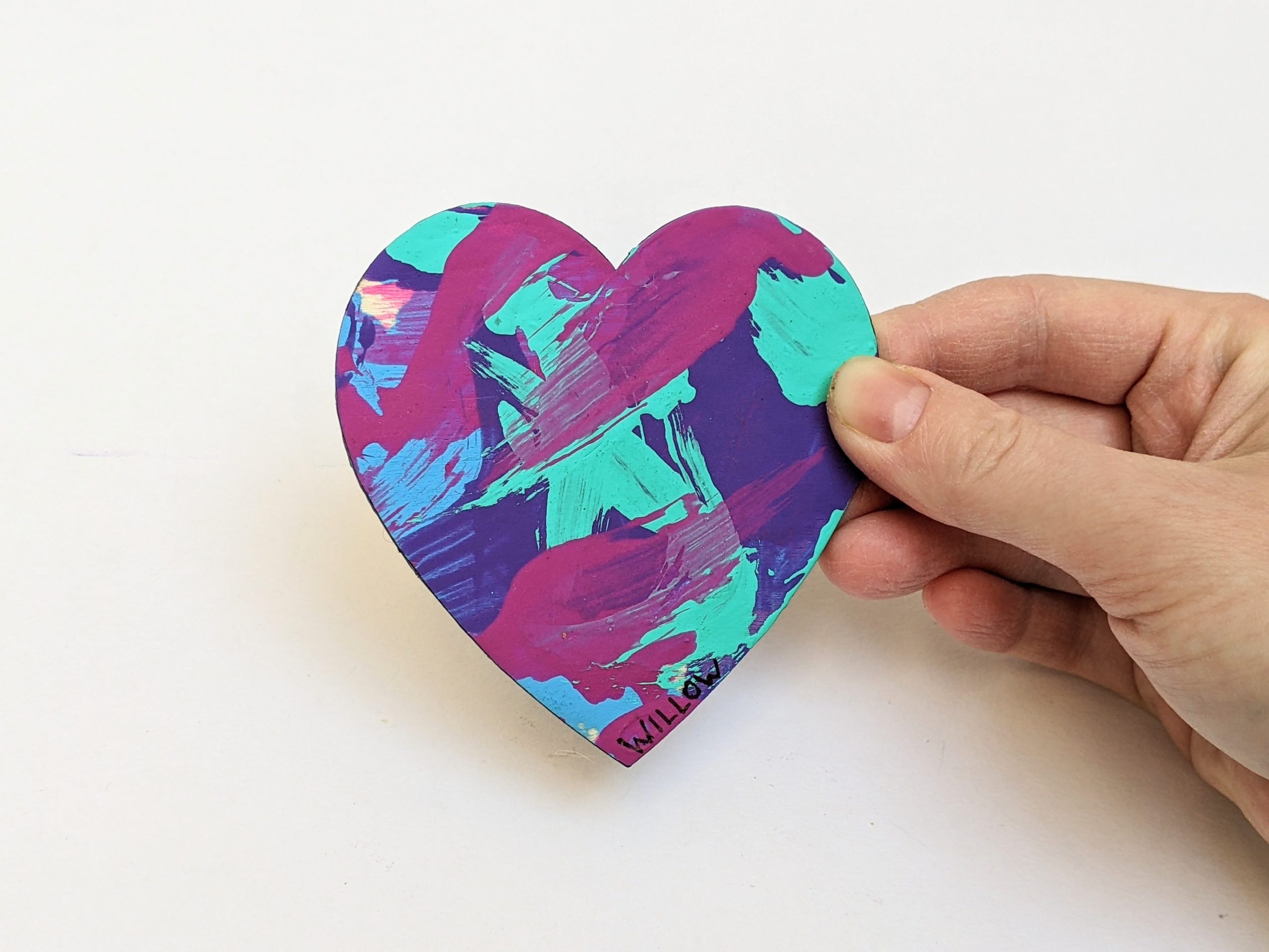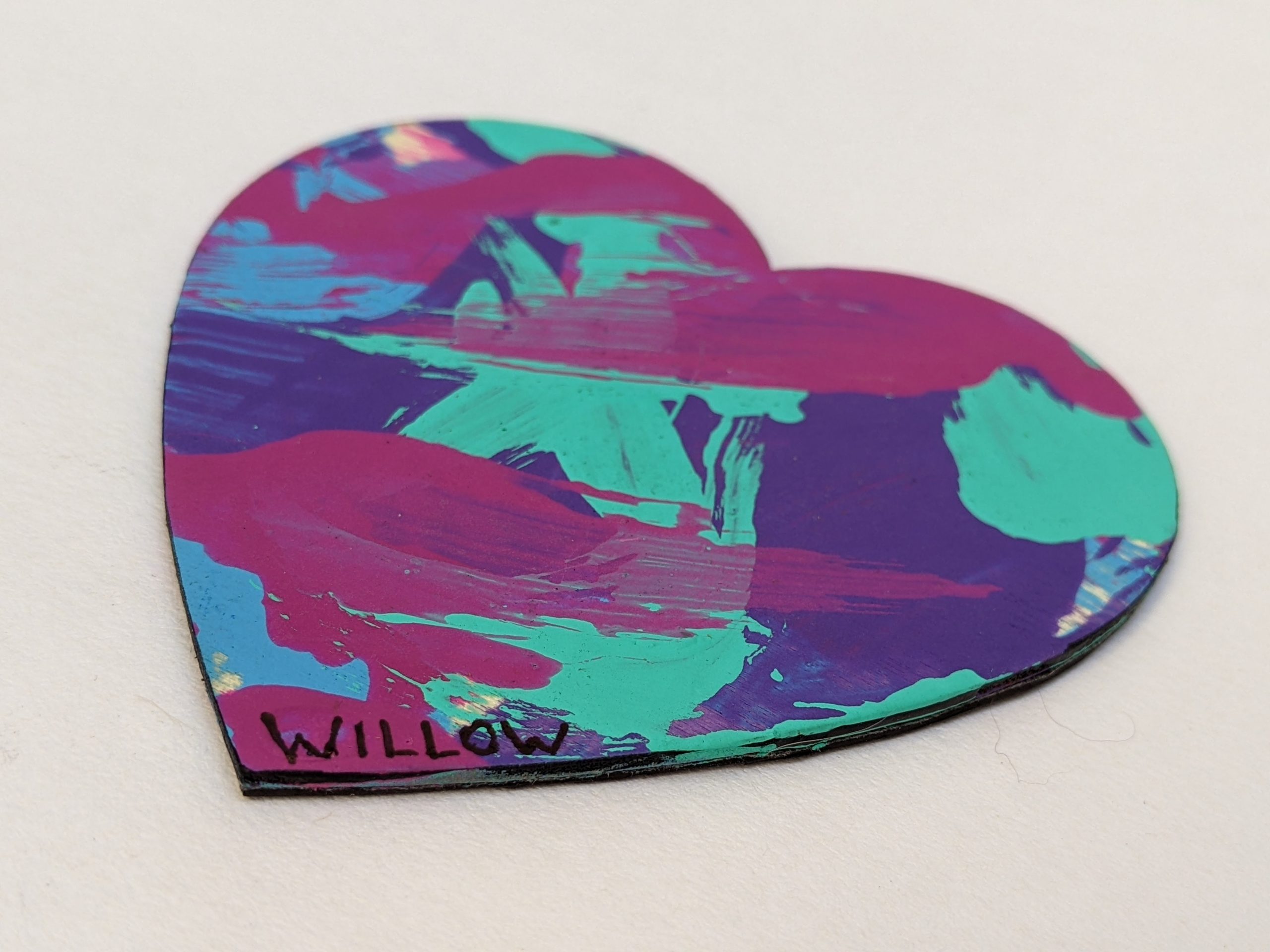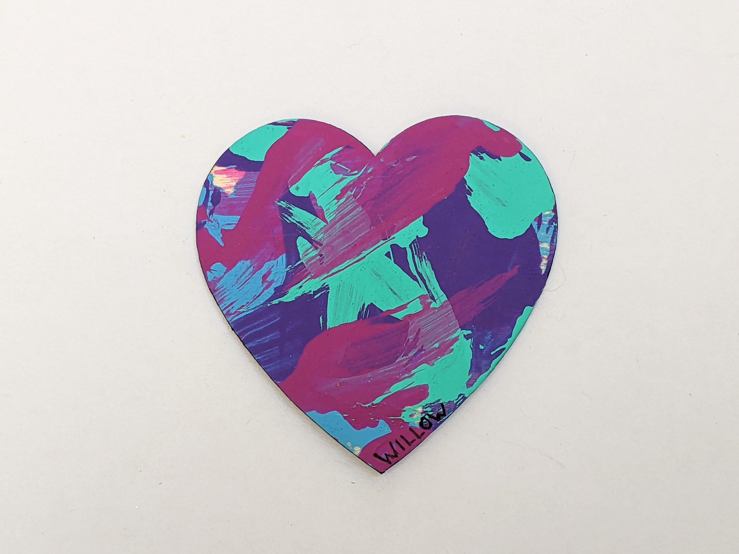 Magnet paintings are so cute and fun to display on the fridge, lockers, or any other metal surface. This adorable heart-shaped magnet features pink, purple, teal, and blue and was made by Willow.