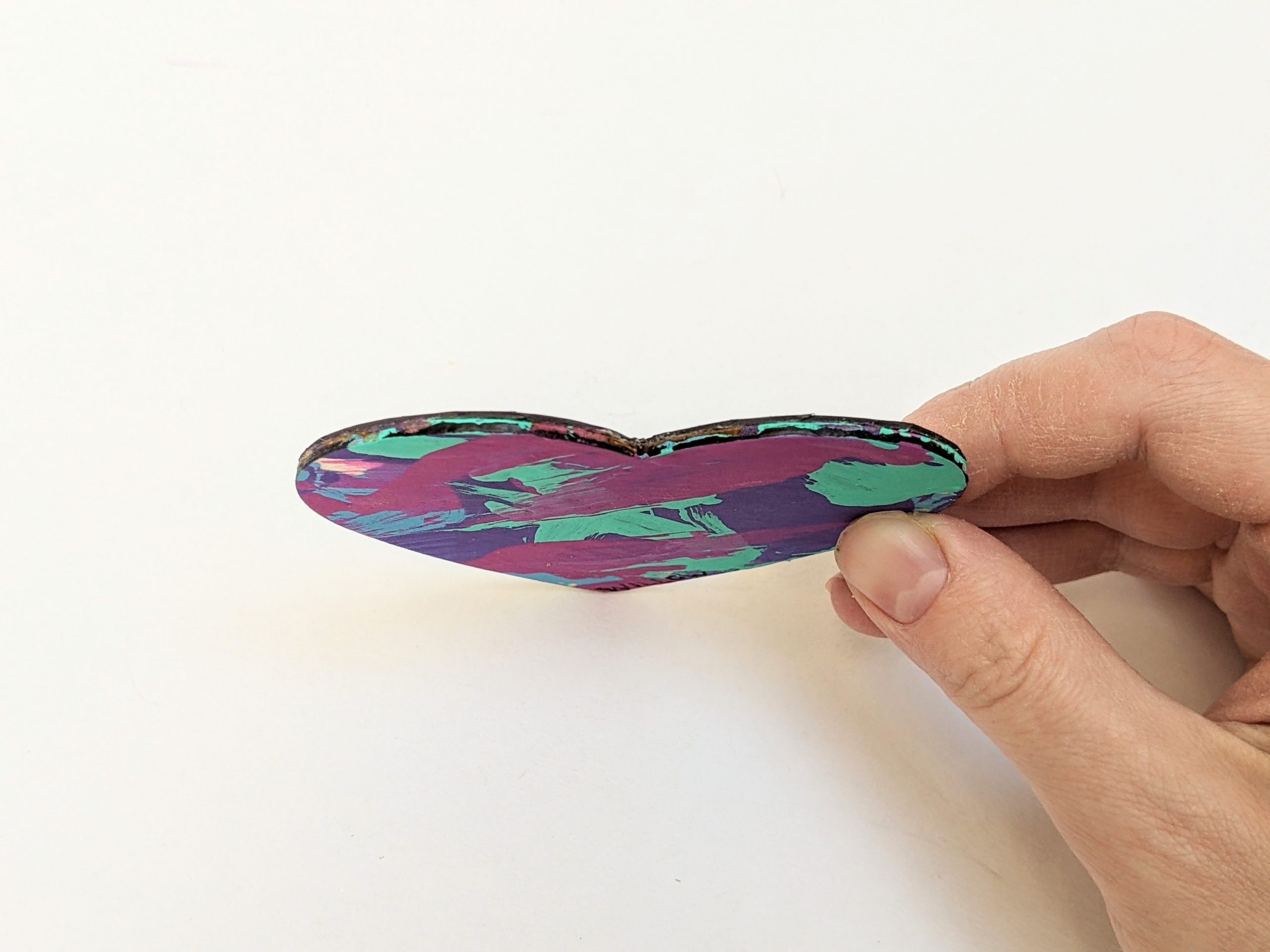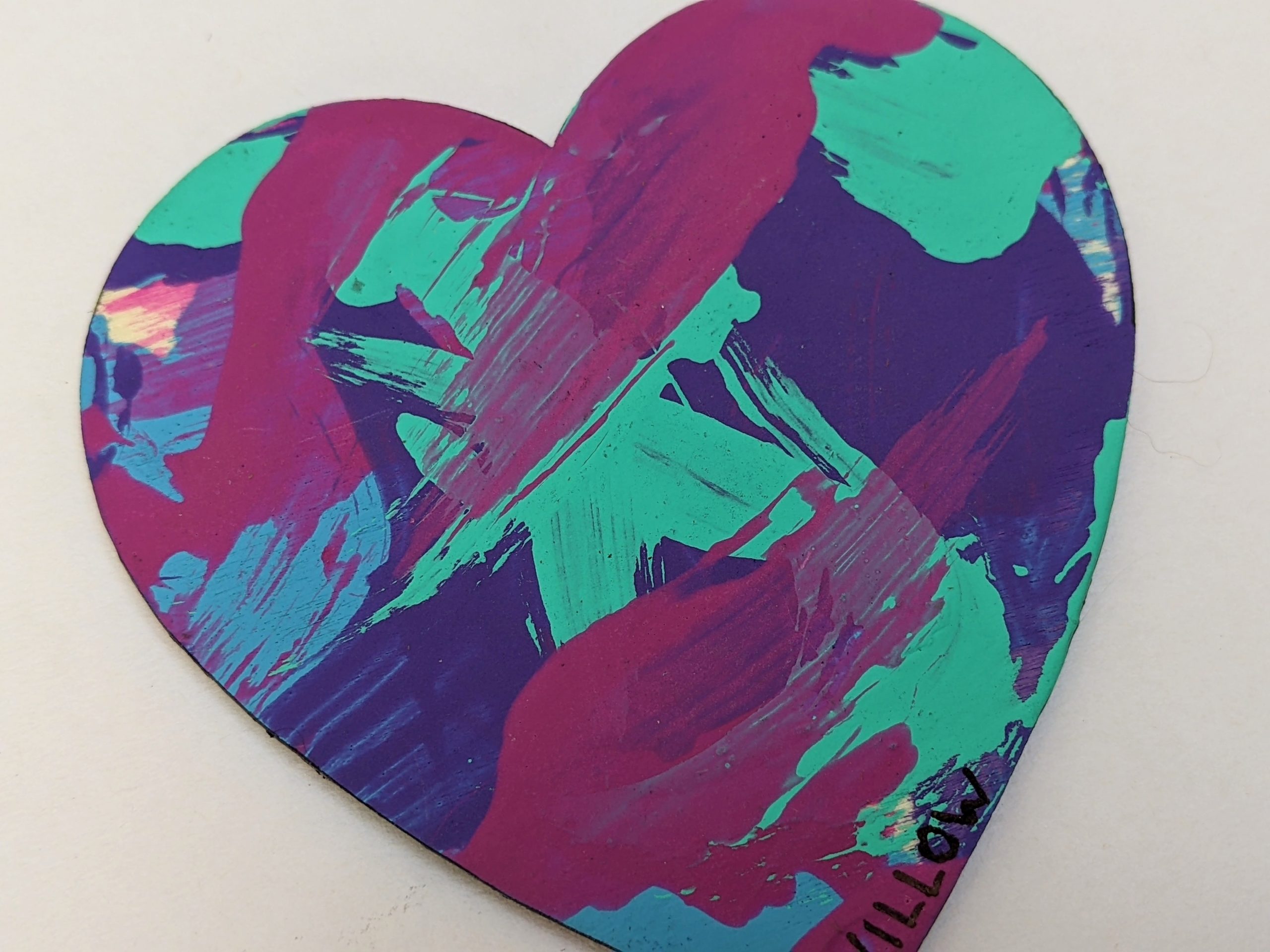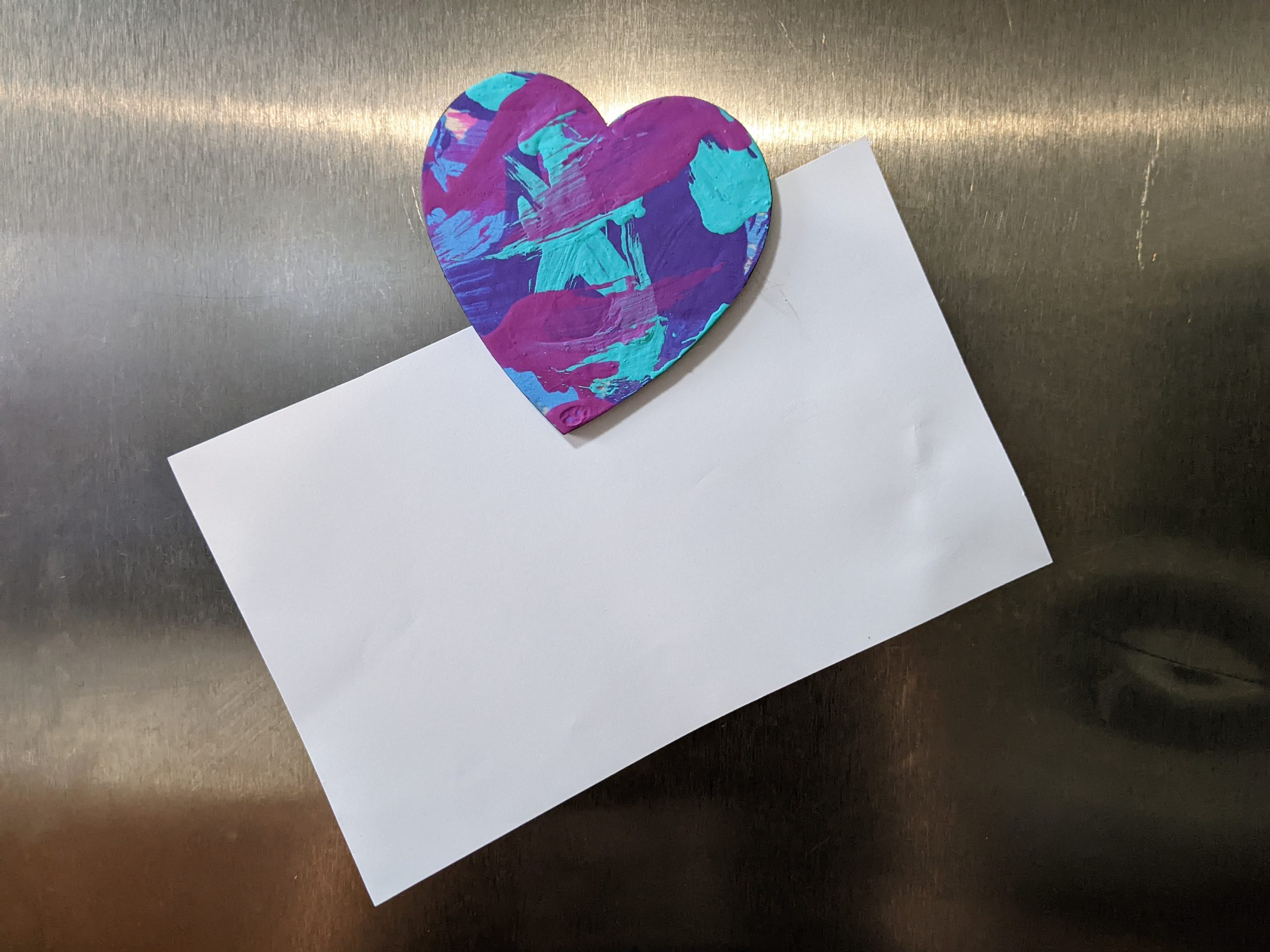 Magnet paintings are so cute and fun to display on the fridge, lockers, or any other metal surface. This adorable heart-shaped magnet features pink, purple, teal, and blue and was made by Willow.