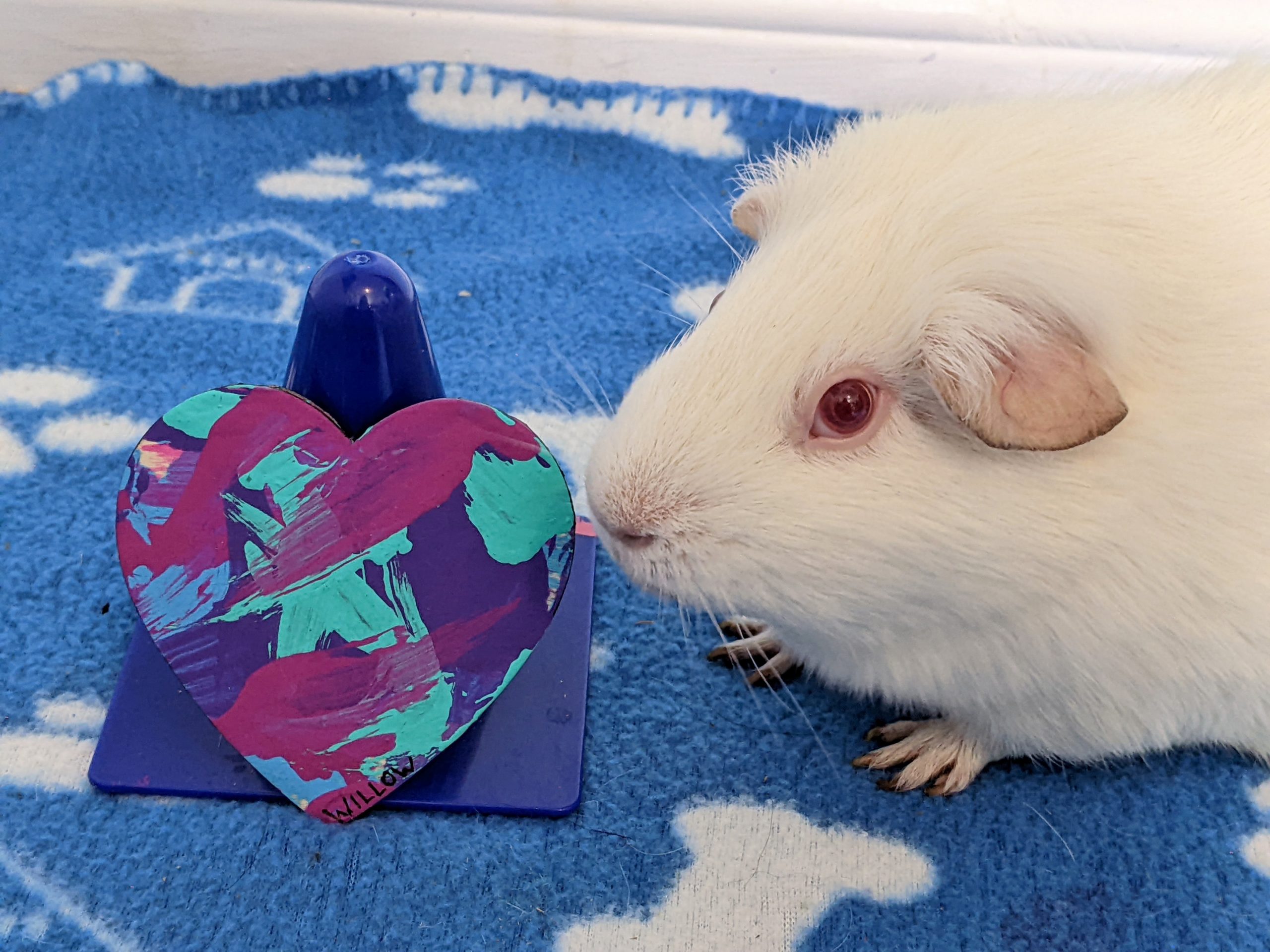 Willow had a rough start to life as an ex-lab piggy, but she has been living with me and her piggy friends over the last couple of years and has truly blossomed into an amazingly sweet and outgoing girl. I’m truly lucky to have her and show the world how colorful these sweet albino piggies are on the inside. ♥︎