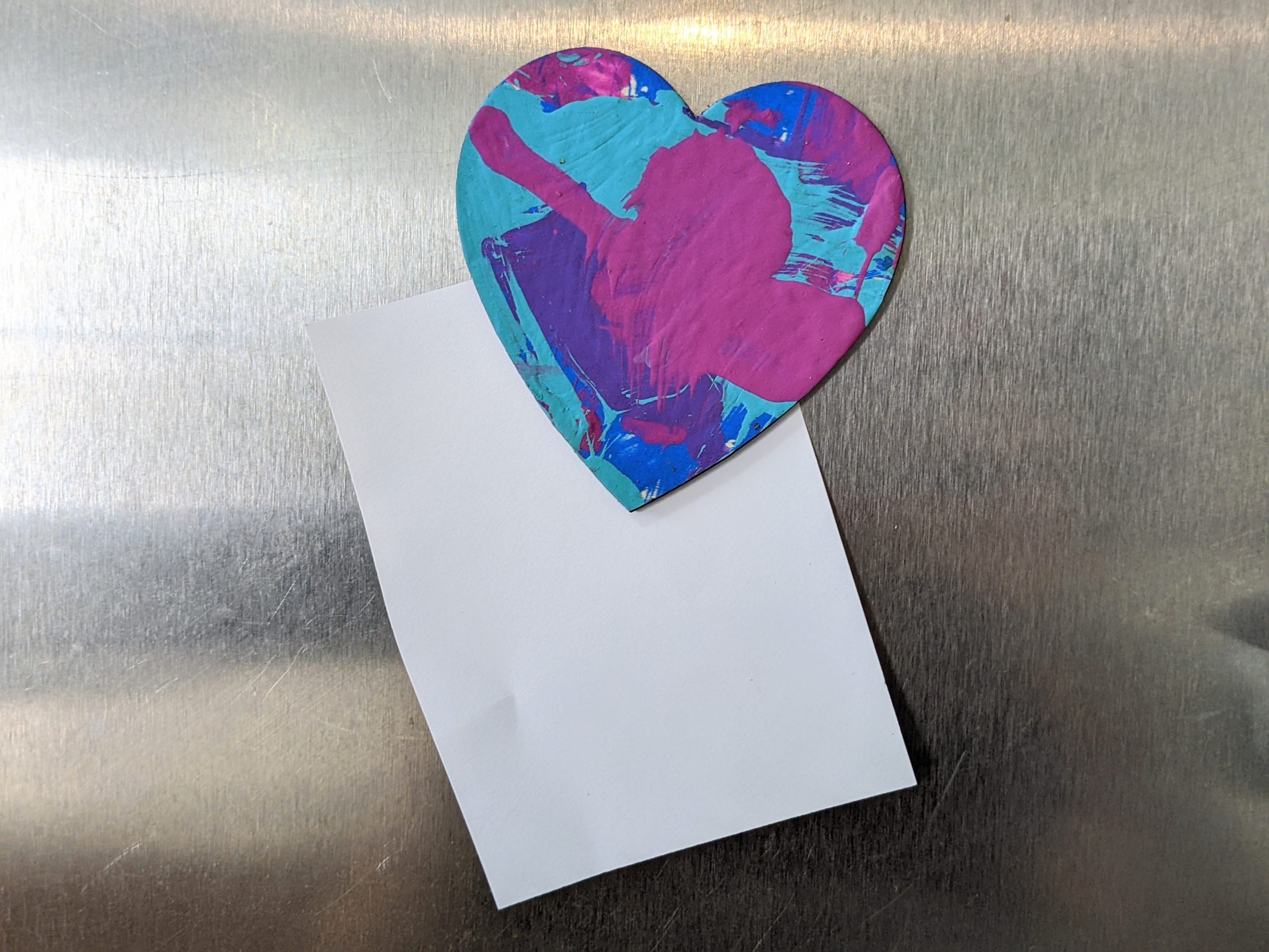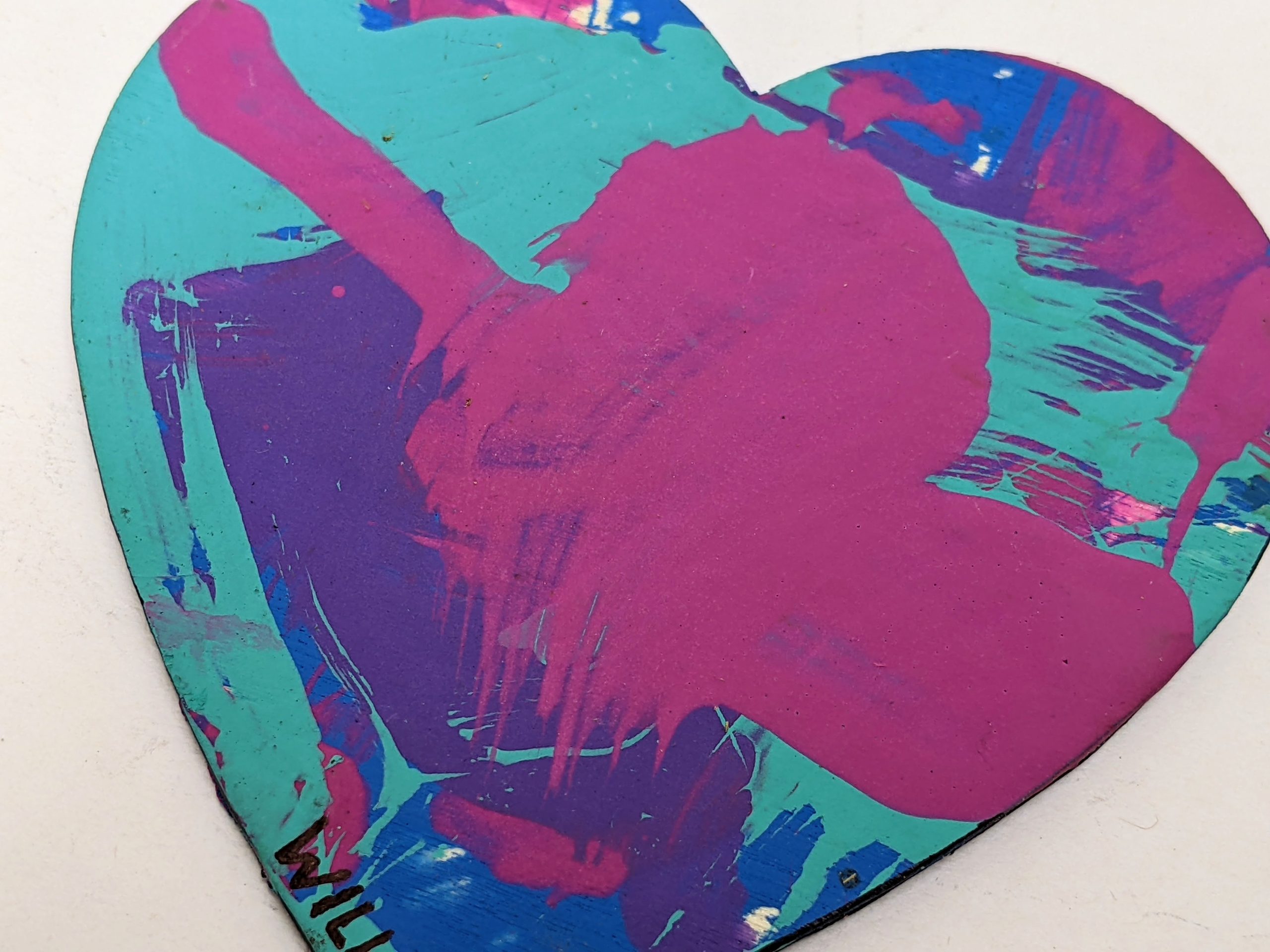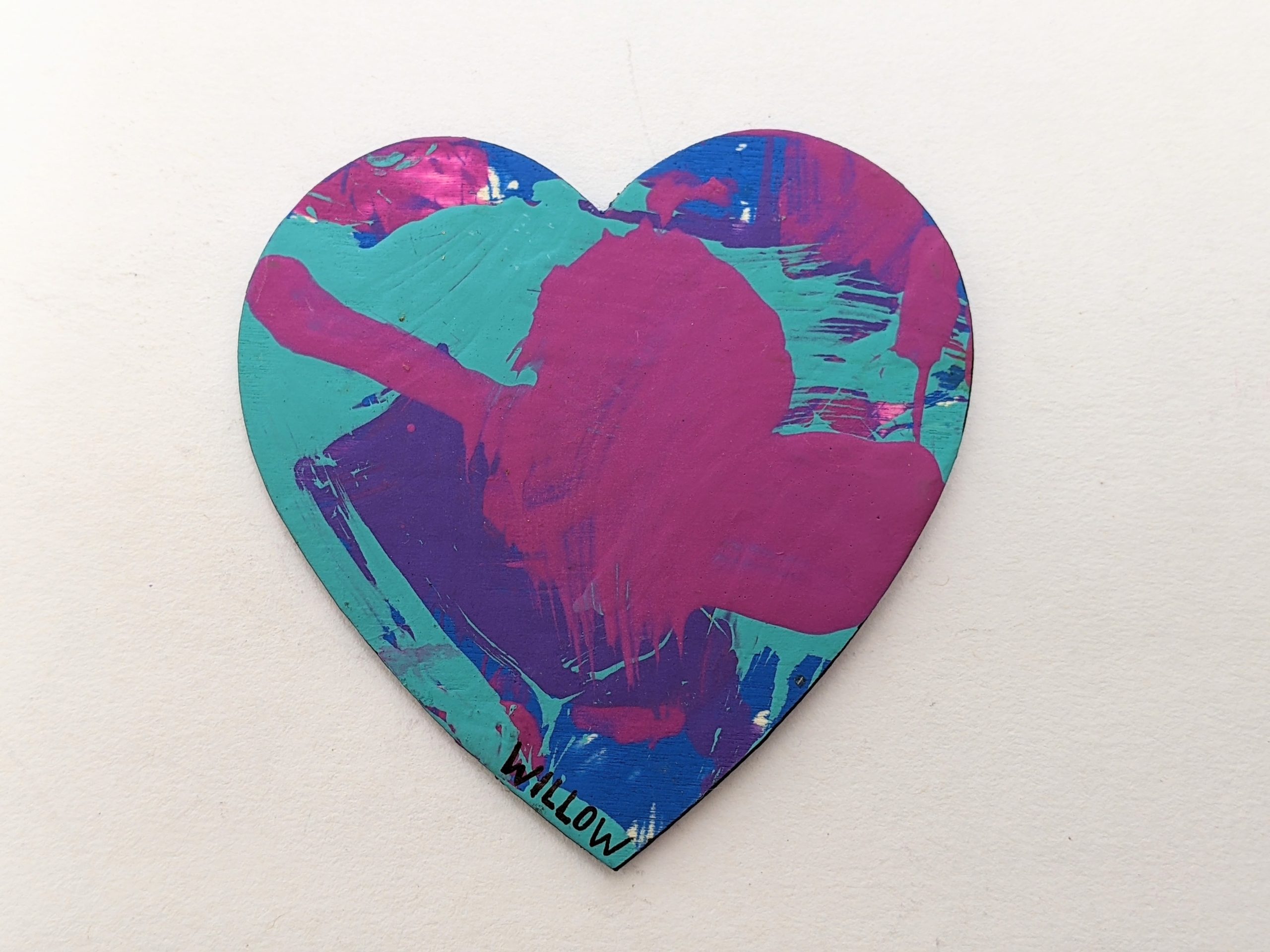 Magnet paintings are so cute and fun to display on the fridge, lockers, or any other metal surface. This adorable heart-shaped magnet features blue, teal, pink, and purple and was made by Willow.