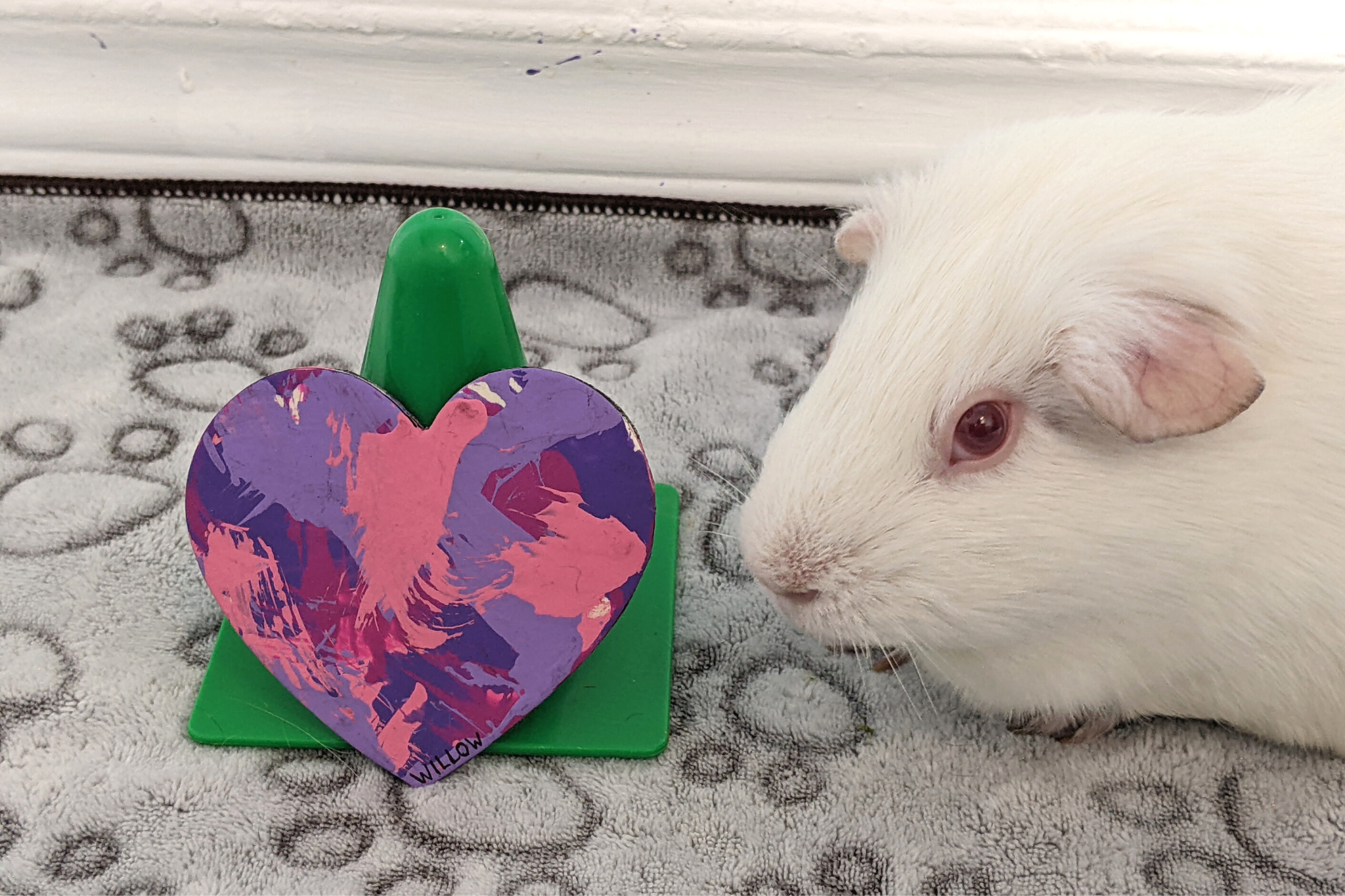 Willow had a rough start to life as an ex-lab piggy, but she has been living with me and her piggy friends over the last couple of years and has truly blossomed into an amazingly sweet and outgoing girl. I’m truly lucky to have her and show the world how colorful these sweet albino piggies are on the inside. ♥︎