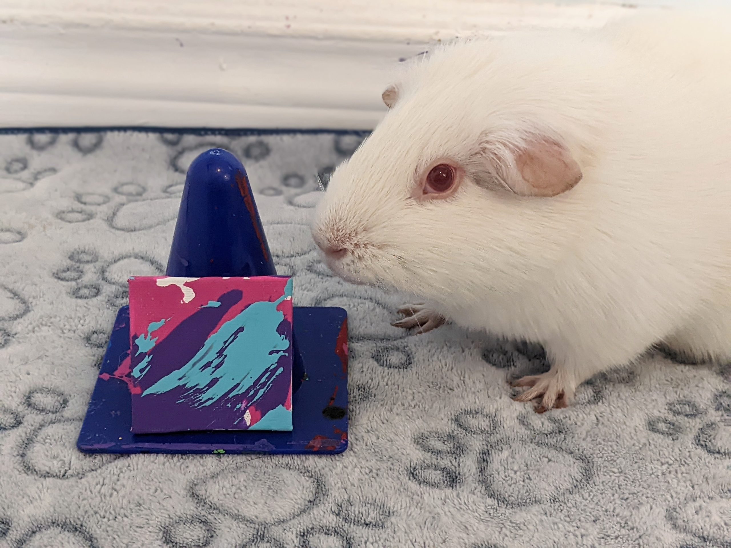 Willow had a rough start to life as an ex-lab piggy, but she has been living with me and her piggy friends over the last couple of years and has truly blossomed into an amazingly sweet and outgoing girl. I’m truly lucky to have her and show the world how colorful these sweet albino piggies are on the inside. ♥︎