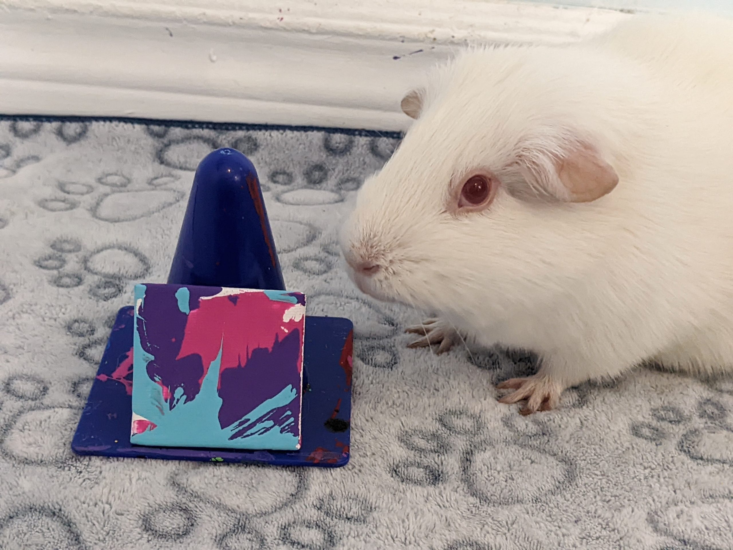 Willow had a rough start to life as an ex-lab piggy, but she has been living with me and her piggy friends over the last couple of years and has truly blossomed into an amazingly sweet and outgoing girl. I’m truly lucky to have her and show the world how colorful these sweet albino piggies are on the inside. ♥︎