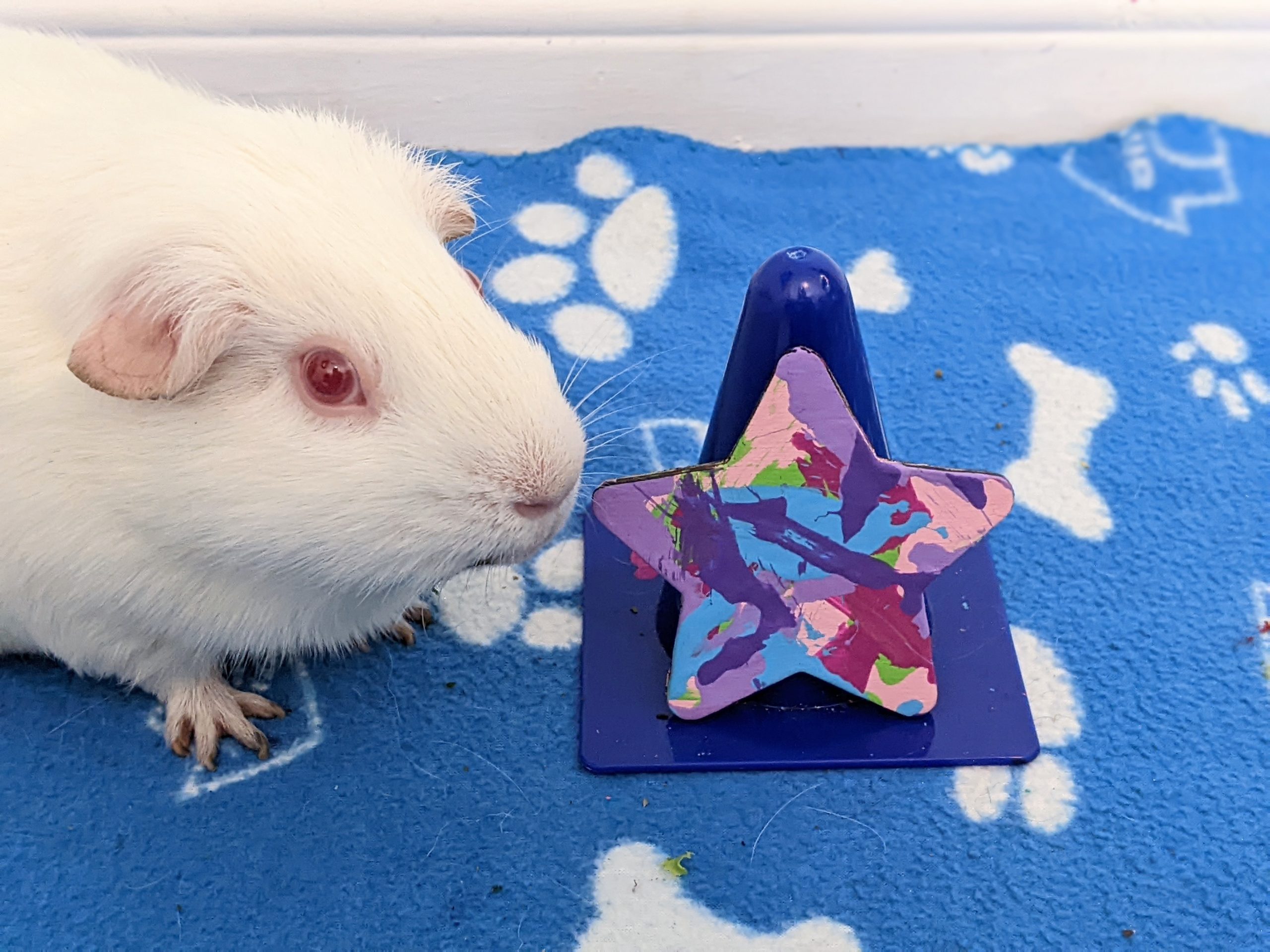 Willow had a rough start to life as an ex-lab piggy, but she has been living with me and her piggy friends over the last couple of years and has truly blossomed into an amazingly sweet and outgoing girl. I’m truly lucky to have her and show the world how colorful these sweet albino piggies are on the inside. ♥︎